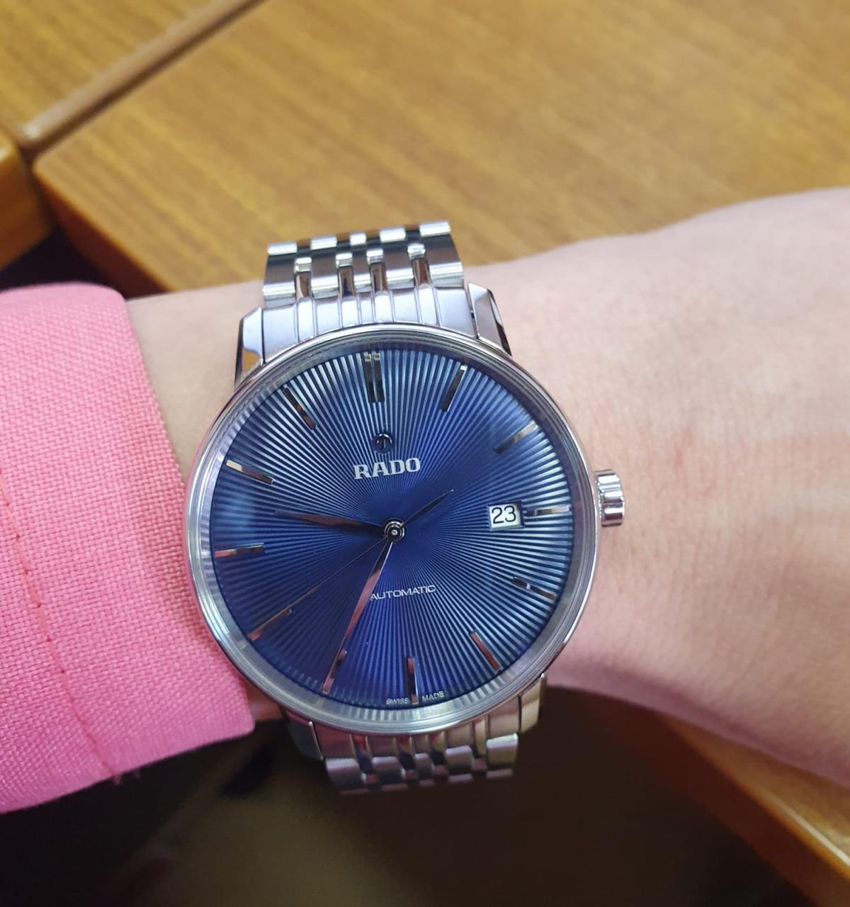 Покупкой очень довольна. Часы отлично сидят на руке, можно сочетать с любым стилем в одежде. Сама модель выглядит шикарно, красивый синий циферблат притягивает взгляды. Браслет выполнен из нержавеющей стали , с удобной застёжкой. Сапфировое  стекло с антибликовым покрытием . Запас хода у этой модели до 80 часов.  Без сомнения, часы Rado — это хорошие часы. Они отличаются превосходными механизмами, первоклассным мастерством и уникальными материалами.