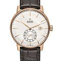 Белый циферблат с оригинальным узором и отдельным секундным счётчиком привлекает минималистичным оформлением. Наручные часы оснащены автоматическим калибром ETA C07.611 с резервом хода на 80 часов, высокая точность подтверждается официальным сертификатом COSCСертификат COSCОфициальный сертификат, подтверждающий то, что часы ходят с особо высокой точностью. Для получения документа часы подвергаются тестовым испытаниям, разработанным швейцарским институтом тестирования хронометров COSC. Допустимая норма для механических часов -4/+6 секунд в день, для кварцевых моделей +/- 0,07 секунд в день.. Скелетонизированная задняя крышка. Прочный корпус с PVD-покрытиемPVDУльтратонкое покрытие наносится в технике вакуумного напыления, сочетает в себе нитрид титана особой прочности со слоем золота или оксида хрома. Несёт в себе декоративную или защитную функцию. цвета розового золота. Сапфировое стекло с антибликовой поверхностью. Ремешок из натуральной кожи. Диаметр корпуса: 41 мм.