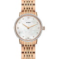 Минималистичная модель отличается компактным перламутровым циферблатом с драгоценными камнями, аксессуар уместно смотрится с любым образом. Роскошный безельБезельВнешний ободок, закрепляющий стекло. В спортивных часах так называется поворотное кольцо с делениями на циферблате, выполняет роль таймера – замеряет отрезки времени на шкале. Неподвижный безель – элемент декора. Однонаправленно вращающийся безель на дайверских часах позволяет фиксировать моменты погружения и выныривания на поверхность. инкрустирован 66 бриллиантами в 0,191 карат. Наручные часы показывают время с повышенной точностью благодаря швейцарскому кварцевому механизму ETA E63.111. Для изготовления корпуса и браслета была выбрана сталь 316L с золотистым PVD-покрытиемPVDУльтратонкое покрытие наносится в технике вакуумного напыления, сочетает в себе нитрид титана особой прочности со слоем золота или оксида хрома. Несёт в себе декоративную или защитную функцию. с устойчивостью к коррозии. Водонепроницаемость до 5 бар. Сапфировое стекло с антибликовой обработкой. . Диаметр корпуса: 27 мм.