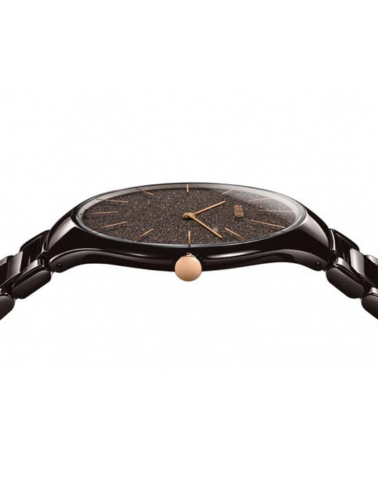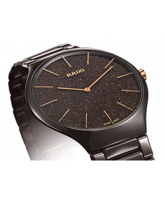 Премиальный аксессуар Special Edition стал символом единения дизайна и природы. Модель в лаконичном стиле отличается оригинальным циферблатом, напоминающим почву – эффект достигается благодаря зерненой структуре коричневого цвета. Корпус моноблочной конструкции изготовлен из нержавеющей стали 316L с PVD-покрытиемPVDУльтратонкое покрытие наносится в технике вакуумного напыления, сочетает в себе нитрид титана особой прочности со слоем золота или оксида хрома. Несёт в себе декоративную или защитную функцию., браслет и безельБезельВнешний ободок, закрепляющий стекло. В спортивных часах так называется поворотное кольцо с делениями на циферблате, выполняет роль таймера – замеряет отрезки времени на шкале. Неподвижный безель – элемент декора. Однонаправленно вращающийся безель на дайверских часах позволяет фиксировать моменты погружения и выныривания на поверхность. из высокотехнологичной керамикиВысокотехнологичная керамикаИнновационный запатентованный Rado материал с гладкой или матовой поверхностью. Керамика за счёт кристаллической структуры обладает повышенной устойчивостью от возникновения царапин. Материал способен принимать температуру тела человека, обеспечивая невероятный комфорт при ношении.. Кварцевый швейцарский механизм ETA 282.001. Антибликовое покрытие сапфирового стекла. Водонепроницаемость до 3 бар. . Диаметр корпуса: 39 мм.