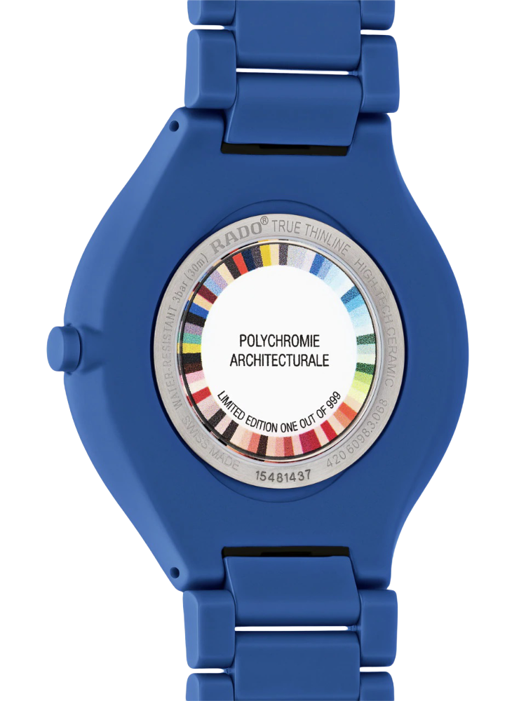 Швейцарские часы из лимитированной серии 999 экземпляров Rado True Thinline Le Corbusier R27092622 , кварцевый механизм с высокой точностью. Сапфировое стекло устойчивое к появлению царапин, обладающее высокой прозрачностью. Класс водозащиты: 30 метров, позволит защитить корпус от случайных брызг или капель дождя. Корпус часов изготовлен из керамики, цвета.