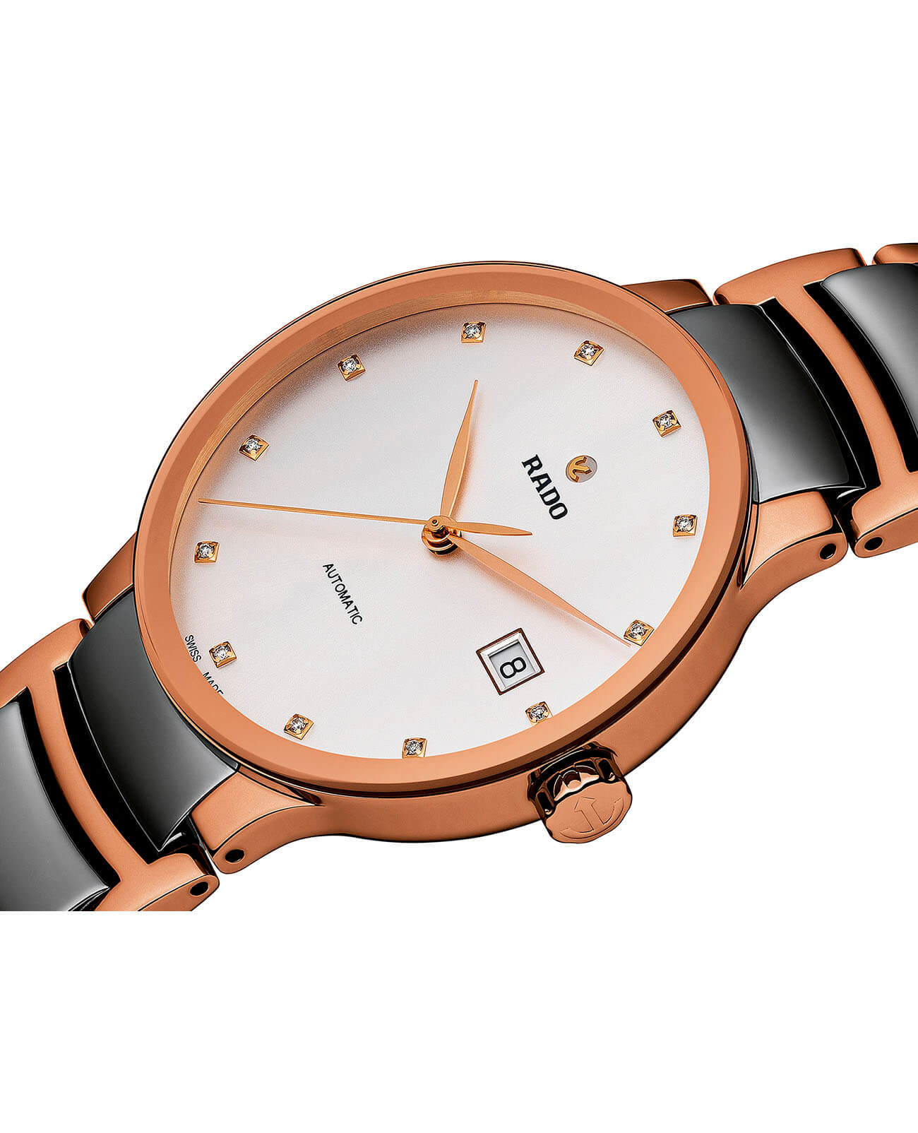 Наручные часы премиальной категории объединяют безупречность стиля и высокую точность хода, позволяя чувствовать себя на высоте в любой ситуации. Циферблат украшен 12 роскошными бриллиантами в 0,045 карат. Привлекательно выглядит сочетание нержавеющей стали 316L с цветным PVD-покрытиемPVDУльтратонкое покрытие наносится в технике вакуумного напыления, сочетает в себе нитрид титана особой прочности со слоем золота или оксида хрома. Несёт в себе декоративную или защитную функцию. и высокотехнологичной керамикиВысокотехнологичная керамикаИнновационный запатентованный Rado материал с гладкой или матовой поверхностью. Керамика за счёт кристаллической структуры обладает повышенной устойчивостью от возникновения царапин. Материал способен принимать температуру тела человека, обеспечивая невероятный комфорт при ношении., такое решение нашло воплощение в браслете. Модель оснащена автоматическим механизмом ETA C07.611, сохраняющим 80-часовой запас хода. Прозрачная задняя крышка. Стекло из сапфира. Индикация числа. Диаметр корпуса: 38 мм.