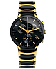 Премиальный хронографХронографФункция позволяет измерять отрезки времени с особой точностью: часы, минуты, секунды. Верным признаком хронографа является наличие на циферблате 3 дополнительных окошек-счётчиков. отличается лаконичным оформлением и использованием сдержанных оттенков. Такое исполнение позволяет носить часы с деловым, повседневным образом, костюмом на торжественный случай. Внутри надёжного корпуса из высокотехнологичной керамикиВысокотехнологичная керамикаИнновационный запатентованный Rado материал с гладкой или матовой поверхностью. Керамика за счёт кристаллической структуры обладает повышенной устойчивостью от возникновения царапин. Материал способен принимать температуру тела человека, обеспечивая невероятный комфорт при ношении. находится кварцевый механизм ETA 251.274 с 22 камнями. Браслет из нержавеющей стали 316L с керамическими вставками и золотистым PVD-покрытиемPVDУльтратонкое покрытие наносится в технике вакуумного напыления, сочетает в себе нитрид титана особой прочности со слоем золота или оксида хрома. Несёт в себе декоративную или защитную функцию.. Сапфировое стекло. Люминесцентная подсветкаЛюминесцентное покрытиеПозволяет считывать показания времени в темноте. Производители наносят на стрелки, часовые индексы, безель или поверхность циферблата светонакопительный состав, дающий холодное свечение.. Апертура даты. Диаметр корпуса: 40 мм.