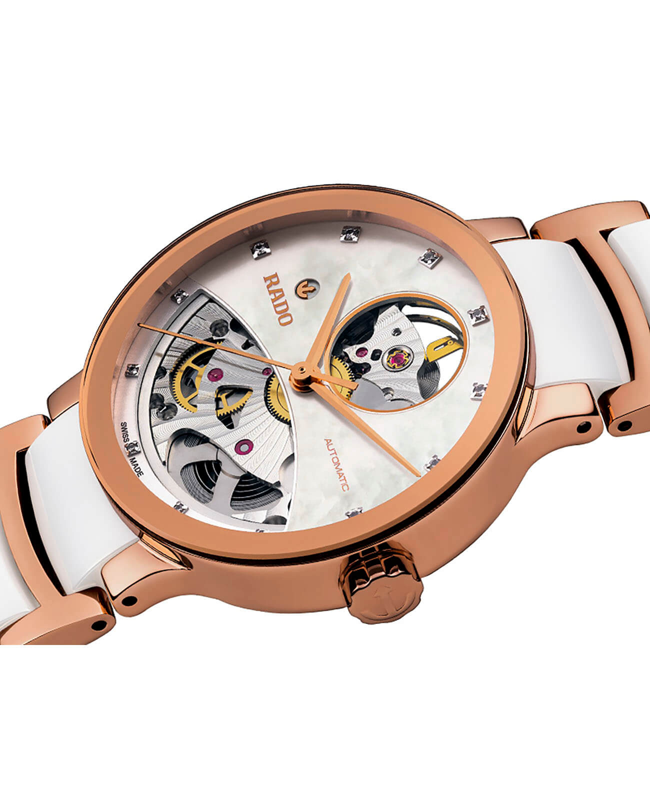 Швейцарские механические часы-скелетоны с автоподзаводом Rado Centrix Automatic Diamonds Open Heart R30248902. Сапфировое стеклоСапфировое стеклоПрочный и надёжный материал из кристалла сапфира синтетического происхождения, характеризующийся особой твёрдостью и устойчивостью к царапинам и повреждениям. устойчивое к мелким механическим повреждениям. Корпус часов изготовлен из нержавеющей стали с PVD-покрытиемPVDУльтратонкое покрытие наносится в технике вакуумного напыления, сочетает в себе нитрид титана особой прочности со слоем золота или оксида хрома. Несёт в себе декоративную или защитную функцию.. Класс водозащиты: 30 метров, позволит защитить корпус от случайных брызг или капель дождя. Браслет из стали PVD-покрытиемPVDУльтратонкое покрытие наносится в технике вакуумного напыления, сочетает в себе нитрид титана особой прочности со слоем золота или оксида хрома. Несёт в себе декоративную или защитную функцию. и высокотехнологичной керамикиВысокотехнологичная керамикаИнновационный запатентованный Rado материал с гладкой или матовой поверхностью. Керамика за счёт кристаллической структуры обладает повышенной устойчивостью от возникновения царапин. Материал способен принимать температуру тела человека, обеспечивая невероятный комфорт при ношении. на раскладной застёжкеРаскладная застёжкаТакой тип застёжки используется только на браслетах из металла. Она никогда не раскрывается полностью, происходит разделение на 2 и более частей. Раскладывающая застёжка снизит вероятность потери часов к минимуму..