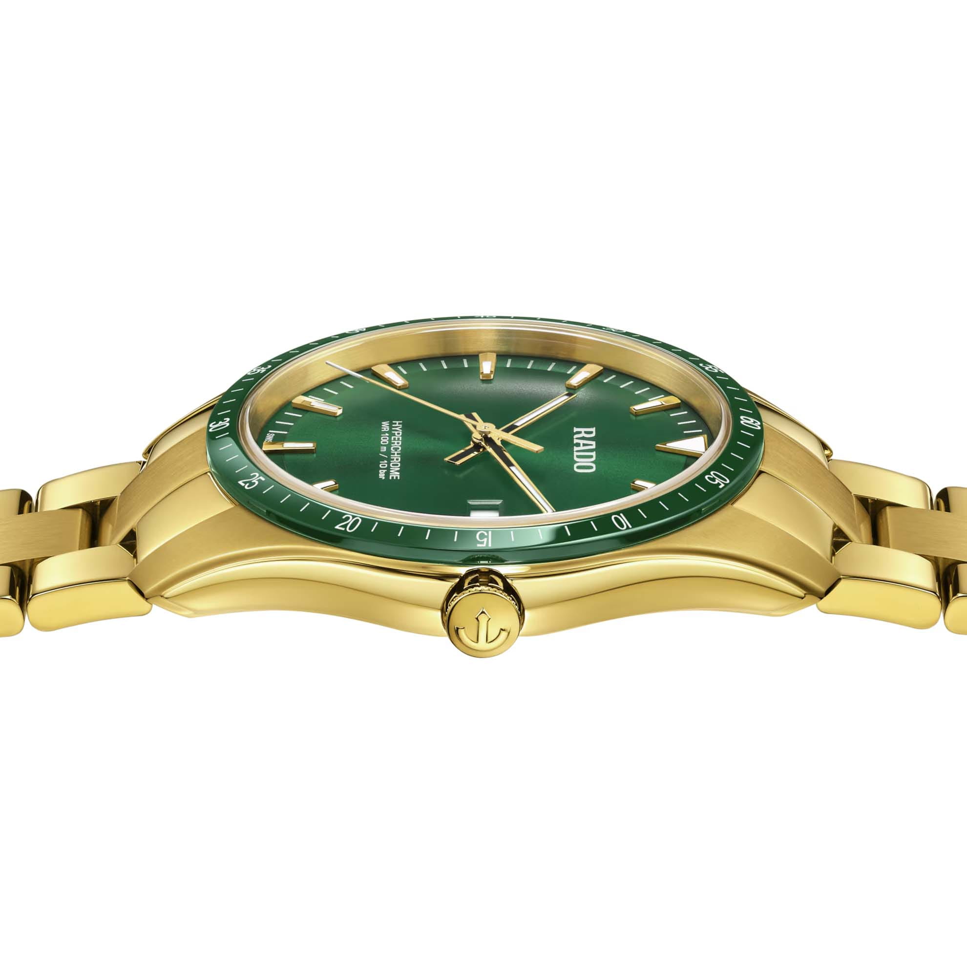 Мужские кварцевые часы Rado HyperChrome — это стильный и современный аксессуар с динамичным дизайном. Корпус диаметром 44,9 мм и толщиной 10,1 мм выполнен из нержавеющей стали с PVD-покрытиемPVDУльтратонкое покрытие наносится в технике вакуумного напыления, сочетает в себе нитрид титана особой прочности со слоем золота или оксида хрома. Несёт в себе декоративную или защитную функцию.. БезельБезельВнешний ободок, закрепляющий стекло. В спортивных часах так называется поворотное кольцо с делениями на циферблате, выполняет роль таймера – замеряет отрезки времени на шкале. Неподвижный безель – элемент декора. Однонаправленно вращающийся безель на дайверских часах позволяет фиксировать моменты погружения и выныривания на поверхность. изготовлен из высокотехнологичной керамикиВысокотехнологичная керамикаИнновационный запатентованный Rado материал с гладкой или матовой поверхностью. Керамика за счёт кристаллической структуры обладает повышенной устойчивостью от возникновения царапин. Материал способен принимать температуру тела человека, обеспечивая невероятный комфорт при ношении. зелёного цвета, придающей часам изысканность и устойчивость к царапинам. Циферблат оформлен индексами и стрелками с люминесцентным покрытиемЛюминесцентное покрытиеПозволяет считывать показания времени в темноте. Производители наносят на стрелки, часовые индексы, безель или поверхность циферблата светонакопительный состав, дающий холодное свечение. Super-Luminova®, обеспечивающим хорошую читаемость в темноте. Механизм — кварцевый калибр R073. Часы оснащены браслетом из нержавеющей стали с PVD-покрытиемPVDУльтратонкое покрытие наносится в технике вакуумного напыления, сочетает в себе нитрид титана особой прочности со слоем золота или оксида хрома. Несёт в себе декоративную или защитную функцию. на застёжке «бабочка» с кнопкамиЗастёжка "бабочка"Такой вид застёжки дополняется предохранителями, помогающими избежать случайного раскрытия браслета. Обладают изящным исполнением. . Универсальный выбор для тех, кто ценит элегантность, надёжность и современный стиль.