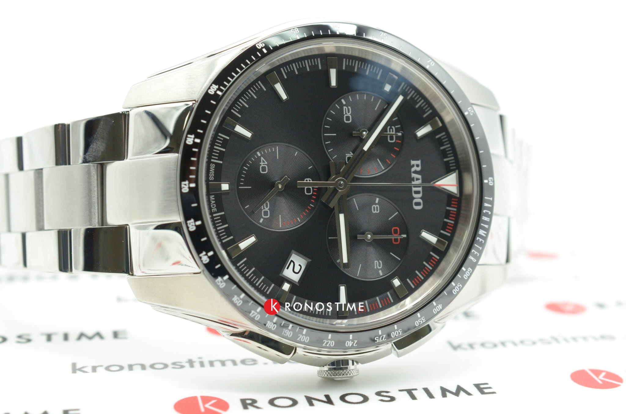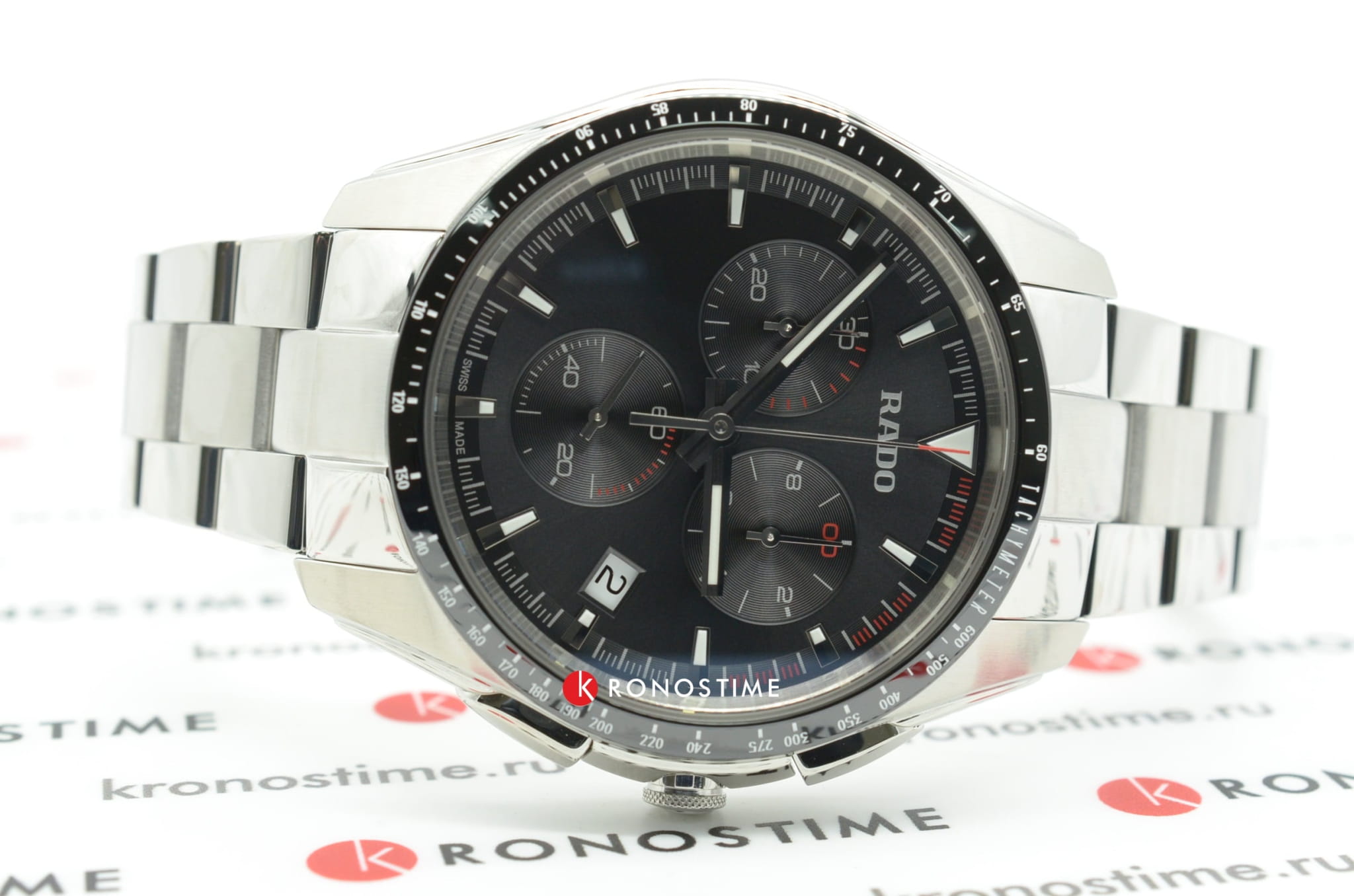 Спортивный хронографХронографФункция позволяет измерять отрезки времени с особой точностью: часы, минуты, секунды. Верным признаком хронографа является наличие на циферблате 3 дополнительных окошек-счётчиков. премиального сегмента позволит чувствовать себя на высоте при любых обстоятельствах, это идеальное дополнение делового или повседневного образа. Чёрный циферблат имеет красные цветовые акценты, придающие общему исполнению динамичности. Кварцевый высокоточный калибр ETA 251.274. Корпус из стали дополнен безелемБезельВнешний ободок, закрепляющий стекло. В спортивных часах так называется поворотное кольцо с делениями на циферблате, выполняет роль таймера – замеряет отрезки времени на шкале. Неподвижный безель – элемент декора. Однонаправленно вращающийся безель на дайверских часах позволяет фиксировать моменты погружения и выныривания на поверхность. из высокотехнологичной керамикиВысокотехнологичная керамикаИнновационный запатентованный Rado материал с гладкой или матовой поверхностью. Керамика за счёт кристаллической структуры обладает повышенной устойчивостью от возникновения царапин. Материал способен принимать температуру тела человека, обеспечивая невероятный комфорт при ношении.. Водостойкость 100 метров. Выпуклое стекло из сапфира с антибликовой поверхностью. Секундомер, календарь, тахиметрТахиметрРазмеченная шкала, располагается на ободке или безеле часов. Тахиметр позволяет рассчитать скорость на определённом участке пути, расстояние измеряется в километрах или милях.. Диаметр корпуса: 44,9 мм.