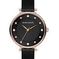 Брендовый аксессуар в стиле fashion отличается эксклюзивным оформлением, над которым работал знаменитый европейский дизайнер Вольфганг Джонсон. Чёрный циферблат с золотистыми стрелками и метками имеет оригинальный узор посередине, по окружности он украшен сияющими цирконами. Привлекательно смотрится браслет плетения Mesh. Кварцевый механизм с высокой точностью хода. Минеральное стекло противостоит образованию царапин. Цветное PVD-покрытиеPVDУльтратонкое покрытие наносится в технике вакуумного напыления, сочетает в себе нитрид титана особой прочности со слоем золота или оксида хрома. Несёт в себе декоративную или защитную функцию. нержавеющей стали. Водонепроницаемость 30 метров. Диаметр корпуса: 34 мм.