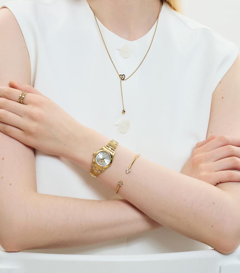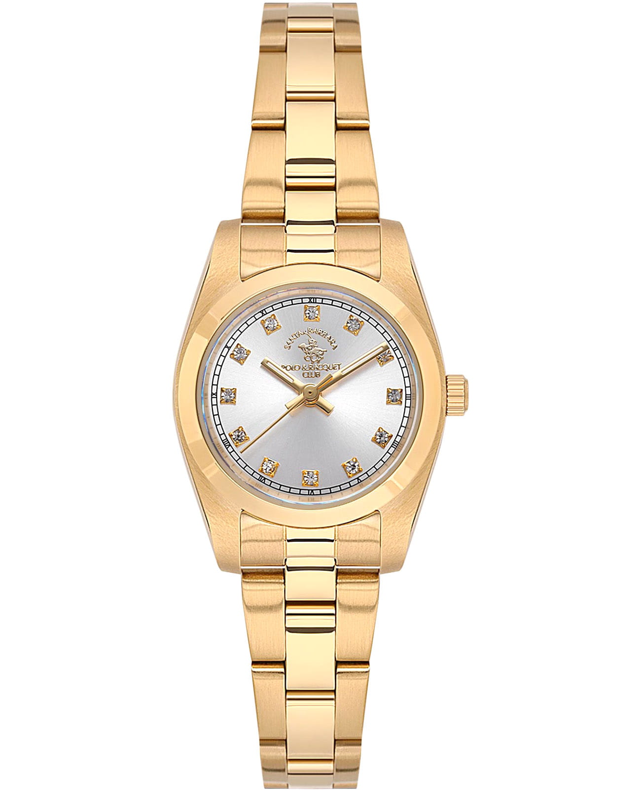 Женские кварцевые часы Santa Barbara Polo & Racquet Club SB.4.10012-4 — это стильный аксессуар, подчеркивающий индивидуальность. Изысканный корпус диаметром 26 мм выполнен из нержавеющей стали 316L с IP-покрытиемIP-покрытиеМетод ионного напыления. Демонстрирует повышенную устойчивость к истиранию, окислению и химическим веществам. Под воздействием высокого давления и температуры около 1500°C молекулы металла надёжно соединяются с частицами корпуса часов. золотистого цвета. Накладные метки в виде точек, украшенных кристаллами, а также фирменным логотипом. Стрелки с люминесцентным покрытиемЛюминесцентное покрытиеПозволяет считывать показания времени в темноте. Производители наносят на стрелки, часовые индексы, безель или поверхность циферблата светонакопительный состав, дающий холодное свечение., обеспечивающим хорошую читаемость в темноте. Защиту циферблата обеспечивает минеральное стеклоМинеральное стеклоМинеральное стекло представляет собой искусственно выращенный минерал кварца. Такое стекло отличается особой устойчивостью к повреждениям и царапинам. Уступает по некоторым качествам сапфировому стеклу., устойчивое к мелким механическим повреждениям. Часы оснащены надежным стальным браслетом с IP-покрытиемIP-покрытиеМетод ионного напыления. Демонстрирует повышенную устойчивость к истиранию, окислению и химическим веществам. Под воздействием высокого давления и температуры около 1500°C молекулы металла надёжно соединяются с частицами корпуса часов. на раскладной застёжкеРаскладная застёжкаТакой тип застёжки используется только на браслетах из металла. Она никогда не раскрывается полностью, происходит разделение на 2 и более частей. Раскладывающая застёжка снизит вероятность потери часов к минимуму.. Водонепроницаемость 30 м позволяет использовать часы в повседневных условиях. Идеальный выбор для тех, кто ценит элегантный дизайн и качество.