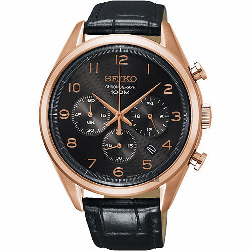 Наручные часы имеют стильный циферблат, дополненный изящным узором – всё в рамках классического стиля. ХронографХронографФункция позволяет измерять отрезки времени с особой точностью: часы, минуты, секунды. Верным признаком хронографа является наличие на циферблате 3 дополнительных окошек-счётчиков. наделён надёжным корпусом, сделанным из нержавеющей стали 316L с PVD-покрытиемPVDУльтратонкое покрытие наносится в технике вакуумного напыления, сочетает в себе нитрид титана особой прочности со слоем золота или оксида хрома. Несёт в себе декоративную или защитную функцию.. Материал был выбран благодаря устойчивости к царапинам и возникновению коррозии. Привлекательным решением стал ремешок из натуральной телячьей кожи с тиснением под крокодиловую кожу. Модель демонстрирует высокую точность хода ±15 секунд в месяц благодаря японскому кварцевому механизму Seiko 8T63. Выпуклое минеральное стекло Hardlex – собственная разработка бренда. Задняя крышка завинчивается, сохраняя герметичность конструкции при давлении 10 бар. Функции: секундомер, отображение текущего числа. Диаметр корпуса: 42,2 мм.