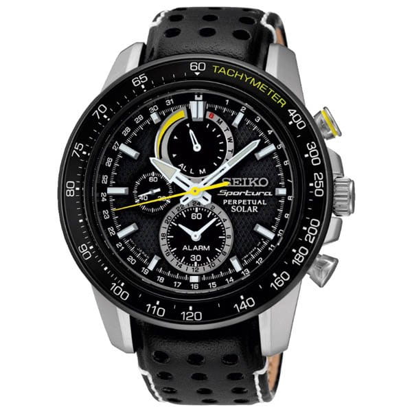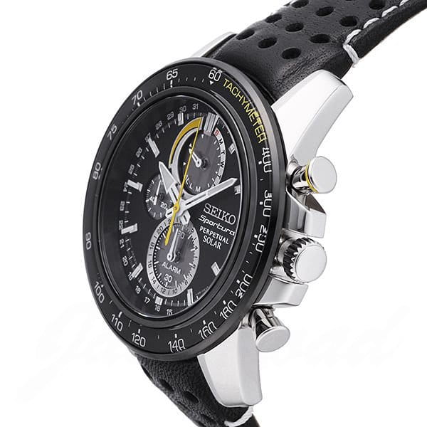 Эффектные мужские часы в современным дизайном. Механизм работает от солнечной энергии, калибр Seiko V198. Корпус круглой формы, с черным аналоговый циферблатом, выполнен из нержавеющей стали с частичным PVD покрытием. Сапфировое  стекло устойчиво к царапинам. Оснащены функциями хронографа, вечного календаря и будильника. Водонепроницаемость 100 м. Часы удерживаются на руке перфорированным кожаным ремешком черного цвета.