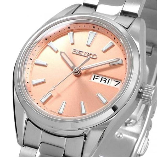 Женские японские часы Seiko CS Dress SUR351P1 c кварцевым механизм с высокой точностью. Сапфировое стеклоСапфировое стеклоПрочный и надёжный материал из кристалла сапфира синтетического происхождения, характеризующийся особой твёрдостью и устойчивостью к царапинам и повреждениям., устойчивое к появлению царапин, обладающее высокой прозрачностью. Класс водозащиты: 100 метров, позволит плавать, нырять и заниматься другими водными видами спорта. Корпус и браслет часов изготовлен из стали. Окошко даты и дня недели находится в положении 3 часа. Браслет с раскладной застёжкойРаскладная застёжкаТакой тип застёжки используется только на браслетах из металла. Она никогда не раскрывается полностью, происходит разделение на 2 и более частей. Раскладывающая застёжка снизит вероятность потери часов к минимуму.. Стрелки и метки с люминесцентным покрытиемЛюминесцентное покрытиеПозволяет считывать показания времени в темноте. Производители наносят на стрелки, часовые индексы, безель или поверхность циферблата светонакопительный состав, дающий холодное свечение. LumiBrite.