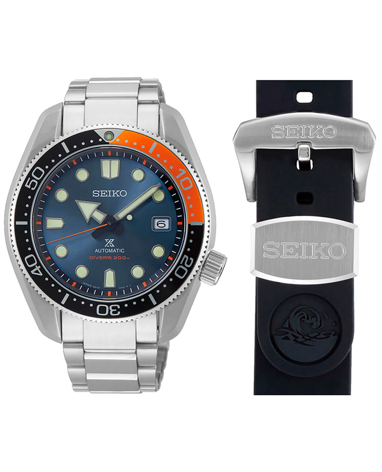 Аксессуар Prospex Twilight Blue дополнен стильным чёрно-оранжевым безелемБезельВнешний ободок, закрепляющий стекло. В спортивных часах так называется поворотное кольцо с делениями на циферблате, выполняет роль таймера – замеряет отрезки времени на шкале. Неподвижный безель – элемент декора. Однонаправленно вращающийся безель на дайверских часах позволяет фиксировать моменты погружения и выныривания на поверхность., выполненным из анодированного алюминия. Часы с автоподзаводом получают энергию от движения руки владельца, японский механизм Seiko 6R15 имеют резерв хода до 50 часов. Модель отличается повышенной водостойкостью 200 метров, чему дополнительно способствуют завинчивающиеся заводная крышка и заводная головка. Сапфировое стекло с антибликовым покрытием обеспечивает оптимальную читаемость данных при ярком освещении. Крупные стрелки и индексы покрыты светонакопительным составом LumiBriteЛюминесцентное покрытиеПозволяет считывать показания времени в темноте. Производители наносят на стрелки, часовые индексы, безель или поверхность циферблата светонакопительный состав, дающий холодное свечение.. В комплектацию к стальному браслету прилагается чёрный ремешок. Прямоугольная апертура даты позволяет всегда быть в курсе событий. Диаметр корпуса: 44 мм.
