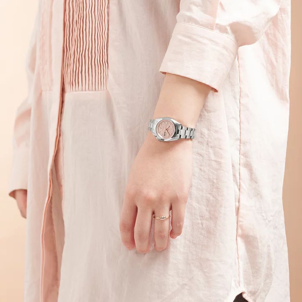 Модель Seiko SRRA003 из коллекции Seiko 5 Sports — это компактные автоматические часы с женственным характером и надёжной механикой. Корпус диаметром 28 мм выполнен из нержавеющей стали и оснащён завинчивающейся задней крышкой. Водозащита составляет 100 метров, что делает модель подходящей для повседневного использования, включая активные занятия. Фиксированный стальной безельБезельВнешний ободок, закрепляющий стекло. В спортивных часах так называется поворотное кольцо с делениями на циферблате, выполняет роль таймера – замеряет отрезки времени на шкале. Неподвижный безель – элемент декора. Однонаправленно вращающийся безель на дайверских часах позволяет фиксировать моменты погружения и выныривания на поверхность. подчёркивает аккуратный силуэт корпуса. Циферблат украшен крупными метками и стрелками, покрытыми люминесцентным покрытиемЛюминесцентное покрытиеПозволяет считывать показания времени в темноте. Производители наносят на стрелки, часовые индексы, безель или поверхность циферблата светонакопительный состав, дающий холодное свечение. LumiBrite, обеспечивая отличную читаемость даже в условиях слабой освещённости. На 3 часах расположен двойной указатель даты и дня недели. Циферблат защищён прочным стеклом Hardlex, устойчивым к царапинам. Внутри установлен автоматический механизм Seiko 2R06 с функцией ручного подзавода, остановкой секундной стрелки и запасом хода до 40 часов. Браслет из нержавеющей стали с шириной 14 мм дополнен удобной раскладной застёжкойРаскладная застёжкаТакой тип застёжки используется только на браслетах из металла. Она никогда не раскрывается полностью, происходит разделение на 2 и более частей. Раскладывающая застёжка снизит вероятность потери часов к минимуму. с кнопкой. Seiko SRRA003 — это гармония изящного дизайна и технологичной надёжности, компактный и стильный выбор для повседневной женской классики.