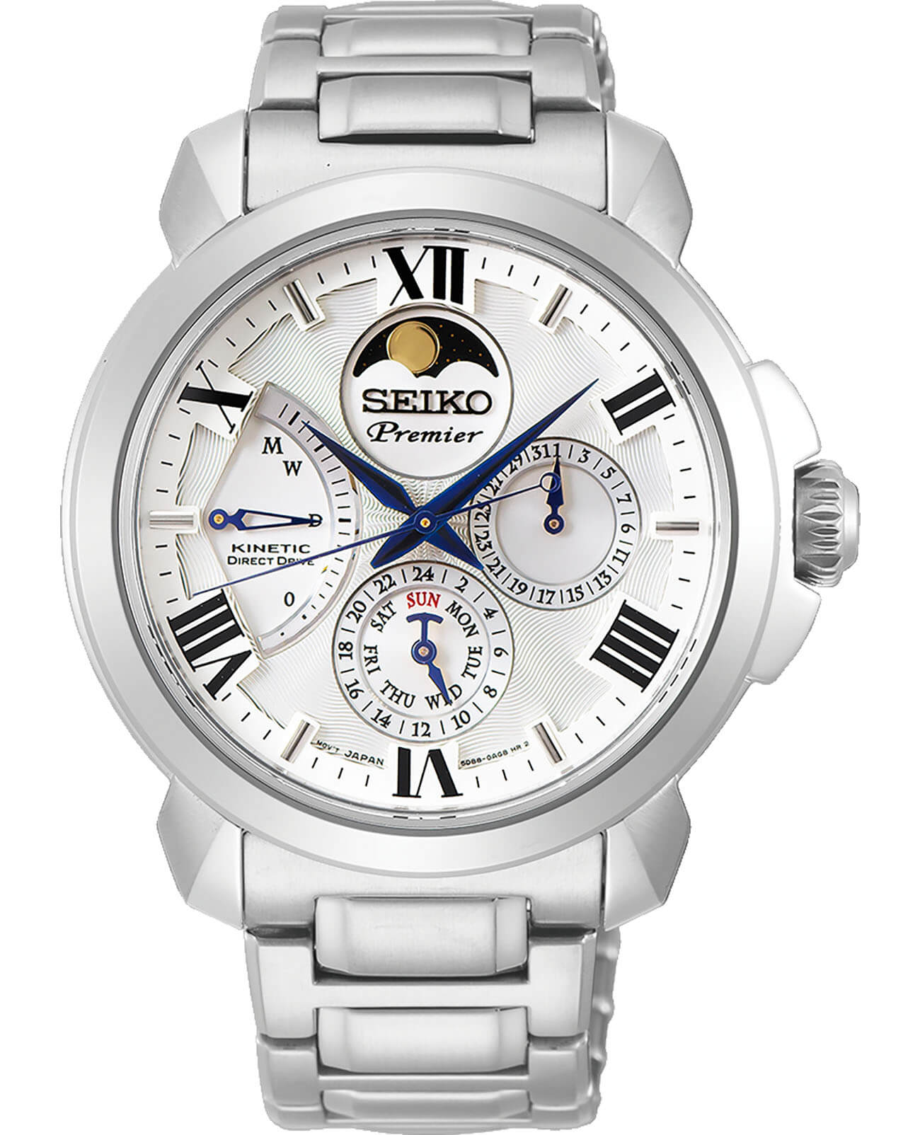 Модель оснащена японским калибром Seiko 5D88, не требующим замены батарейки (автокварц). Энергия для работы генерируется за счёт движения руки владельца. На циферблате размещён лунный календарь, окошки даты и дня недели, ретроградный указатель резерва хода. Корпус и браслет выполнены из нержавеющей стали 316L. Сапфировое стекло устойчиво к царапинам.