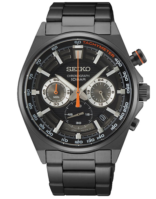 Мужские японские часы Seiko SSB399P1 c хронографомХронографФункция позволяет измерять отрезки времени с особой точностью: часы, минуты, секунды. Верным признаком хронографа является наличие на циферблате 3 дополнительных окошек-счётчиков., кварцевый механизм с высокой точностью. Минеральное стеклоМинеральное стеклоМинеральное стекло представляет собой искусственно выращенный минерал кварца. Такое стекло отличается особой устойчивостью к повреждениям и царапинам. Уступает по некоторым качествам сапфировому стеклу., устойчивое к появлению царапин, обладающее высокой прозрачностью. Класс водозащиты: 100 метров, позволит плавать, нырять и заниматься другими водными видами спорта. Корпус и браслет часов изготовлены из стали с PVD-покрытиемPVDУльтратонкое покрытие наносится в технике вакуумного напыления, сочетает в себе нитрид титана особой прочности со слоем золота или оксида хрома. Несёт в себе декоративную или защитную функцию.. Неподвижный безельБезельВнешний ободок, закрепляющий стекло. В спортивных часах так называется поворотное кольцо с делениями на циферблате, выполняет роль таймера – замеряет отрезки времени на шкале. Неподвижный безель – элемент декора. Однонаправленно вращающийся безель на дайверских часах позволяет фиксировать моменты погружения и выныривания на поверхность. со шкалой тахиметраТахиметрРазмеченная шкала, располагается на ободке или безеле часов. Тахиметр позволяет рассчитать скорость на определённом участке пути, расстояние измеряется в километрах или милях.. Стрелки и метки с люминесцентным покрытиемЛюминесцентное покрытиеПозволяет считывать показания времени в темноте. Производители наносят на стрелки, часовые индексы, безель или поверхность циферблата светонакопительный состав, дающий холодное свечение. LumiBrite. Браслет на раскладной застёжкеРаскладная застёжкаТакой тип застёжки используется только на браслетах из металла. Она никогда не раскрывается полностью, происходит разделение на 2 и более частей. Раскладывающая застёжка снизит вероятность потери часов к минимуму. с кнопками. СекундомерСекундомерСекундоме́р — прибор, способный измерять интервалы времени с точностью до долей секунды.. Окошко даты находится в положении между 4 и 5 часов.