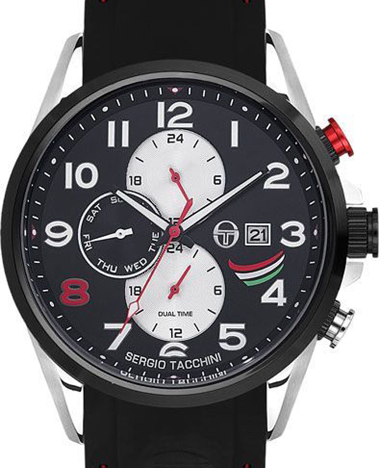 Мужские кварцевые часы Sergio Tacchini из коллекции Archivio — это надёжный спортивный аксессуар с функциональным дизайном. Корпус диаметром 46,5 мм выполнен из нержавеющей стали 316L.  БезельБезельВнешний ободок, закрепляющий стекло. В спортивных часах так называется поворотное кольцо с делениями на циферблате, выполняет роль таймера – замеряет отрезки времени на шкале. Неподвижный безель – элемент декора. Однонаправленно вращающийся безель на дайверских часах позволяет фиксировать моменты погружения и выныривания на поверхность. с PVD-покрытиемPVDУльтратонкое покрытие наносится в технике вакуумного напыления, сочетает в себе нитрид титана особой прочности со слоем золота или оксида хрома. Несёт в себе декоративную или защитную функцию.. Циферблат чёрного цвета оформлен индексами и стрелками. Указатели дня недели и даты вынесены на отдельные субциферблаты, также присутствует индикация 24-часового формата времени и второй часовой пояс. Стрелки с люминесцентным покрытиемЛюминесцентное покрытиеПозволяет считывать показания времени в темноте. Производители наносят на стрелки, часовые индексы, безель или поверхность циферблата светонакопительный состав, дающий холодное свечение., обеспечивающим хорошую читаемость в темноте. Циферблат защищён минеральным стекломМинеральное стеклоМинеральное стекло представляет собой искусственно выращенный минерал кварца. Такое стекло отличается особой устойчивостью к повреждениям и царапинам. Уступает по некоторым качествам сапфировому стеклу. с антибликовым покрытиемАнтибликовое покрытиеСлой оксида металла в 0,13-0,3 микрон, благодаря которому стекло часов не бликует и не отражает свет. Антибликовое покрытие уменьшает отражение света в 10 раз, обеспечивая отличную читаемость показателей циферблата.. Часы оснащены силиконовым ремешком чёрного цвета с стандартной застёжкой. Водонепроницаемость 50 м позволяет использовать часы в повседневных условиях. Идеальный выбор для тех, кто ценит стиль, функциональность и комфорт.