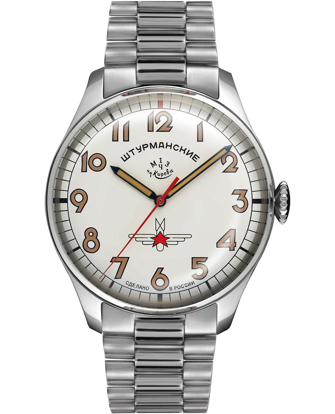 Штурманские мужские российские механические часы 2609/9045924B с механизмом высокой точности. Класс водозащиты: 30 метров, позволит защитить корпус от случайных брызг или капель дождя. Корпус часов изготовлен из стали. Сапфировое стеклоСапфировое стеклоПрочный и надёжный материал из кристалла сапфира синтетического происхождения, характеризующийся особой твёрдостью и устойчивостью к царапинам и повреждениям. устойчивое к мелким механическим повреждениям. Стальной браслет на раскладной застёжкойРаскладная застёжкаТакой тип застёжки используется только на браслетах из металла. Она никогда не раскрывается полностью, происходит разделение на 2 и более частей. Раскладывающая застёжка снизит вероятность потери часов к минимуму.. Стрелки и метки с люминесцентным покрытиемЛюминесцентное покрытиеПозволяет считывать показания времени в темноте. Производители наносят на стрелки, часовые индексы, безель или поверхность циферблата светонакопительный состав, дающий холодное свечение.. Задняя крышка украшена портретом Юрия Гагарина и крепится на 4-х винтах.