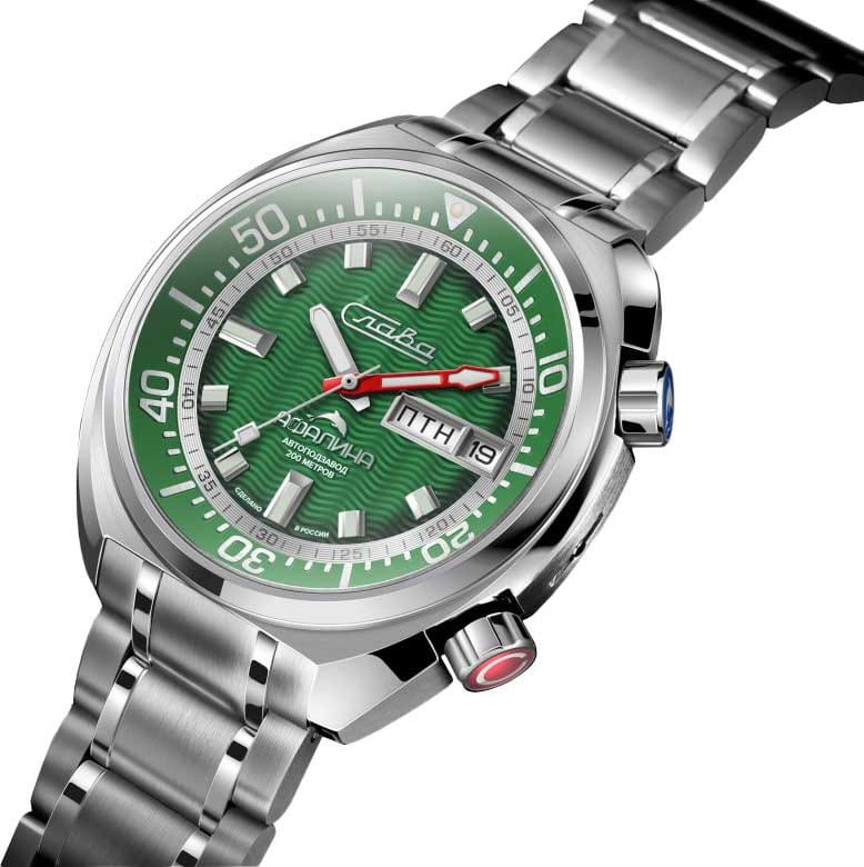 Коллекционные часы Слава Афалина 2430516/100-2427 — это превосходный выбор для тех, кто ценит стиль и функциональность. Модель из лимитированной серии, состоящей всего из 500 экземпляров, отличается прочным стальным корпусом и предназначена для любителей дайвинга. Часы оснащены надежным механическим механизмом с автоподзаводом и водозащитой до 200 метров, что делает их идеальными для подводных приключений. Зеленый циферблат дополняется стрелками с люминесцентным покрытиемЛюминесцентное покрытиеПозволяет считывать показания времени в темноте. Производители наносят на стрелки, часовые индексы, безель или поверхность циферблата светонакопительный состав, дающий холодное свечение. для отличной видимости в условиях низкой освещенности, а сапфировое стеклоСапфировое стеклоПрочный и надёжный материал из кристалла сапфира синтетического происхождения, характеризующийся особой твёрдостью и устойчивостью к царапинам и повреждениям. с антибликовым покрытиемАнтибликовое покрытиеСлой оксида металла в 0,13-0,3 микрон, благодаря которому стекло часов не бликует и не отражает свет. Антибликовое покрытие уменьшает отражение света в 10 раз, обеспечивая отличную читаемость показателей циферблата. защищает от царапин и бликов. Основная заводная головка расположена на корпусе ближе к отметке ''4 часа'', она позволяет настраивать время и заводить часы перед погружением. С помощью второй головки, расположенной у отметки ''2 часа'', можно управлять вращающимся внутренним кольцом безеляБезельВнешний ободок, закрепляющий стекло. В спортивных часах так называется поворотное кольцо с делениями на циферблате, выполняет роль таймера – замеряет отрезки времени на шкале. Неподвижный безель – элемент декора. Однонаправленно вращающийся безель на дайверских часах позволяет фиксировать моменты погружения и выныривания на поверхность. с PVDPVDУльтратонкое покрытие наносится в технике вакуумного напыления, сочетает в себе нитрид титана особой прочности со слоем золота или оксида хрома. Несёт в себе декоративную или защитную функцию. покрытием зеленого цвета и фиксировать его в нужном положении. Окошко даты и дня недели удобно расположено на отметке "3 часа", а профессиональная "дайвинг-застежка" стального браслета имеет удлинение для гидрокостюма. Особая забота о природе: часть средств от продажи данной модели перечисляется в центр спасения дельфинов "Дельфа". Часы серии "Афалина" — это не только функциональный аксессуар, но и символ вашей поддержки благородного дела.