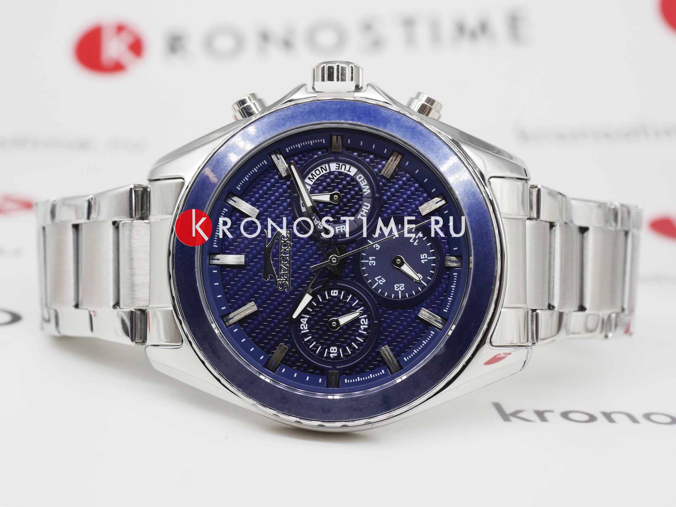 Мужские наручные часы Slazenger SL.09.2022.2.01 сочетают в себе классический дизайн и надежность современных технологий. Модель обладает круглым корпусом диаметром 45 мм, изготовленным из суперметалла, что обеспечивает высокую устойчивость к внешним воздействиям. Браслет выполнен из суперметалла серебристого цвета с раскладной застежкойРаскладной замокДанный вариант застежки используется только на часах с металлическим браслетом. Отличительная особенность такого крепления в том, что длина браслета становится универсальной и вы можете самостоятельно отрегулировать нужный вам размер – застежка просто двигается по браслету часов., гарантирующей комфортное ношение и безопасность. Циферблат декорирован стрелками с люминесцентным покрытиемЛюминесцентное покрытиеПозволяет считывать показания времени в темноте. Производители наносят на стрелки, часовые индексы, безель или поверхность циферблата светонакопительный состав, дающий холодное свечение., а дополнительные малые циферблаты отображают дату, день недели и текущее время в 24-часовом формате. Для защиты используется минеральное стеклоМинеральное стеклоМинеральное стекло представляет собой искусственно выращенный минерал кварца. Такое стекло отличается особой устойчивостью к повреждениям и царапинам. Уступает по некоторым качествам сапфировому стеклу., обеспечивающее прочную защиту от царапин. БезельБезельВнешний ободок, закрепляющий стекло. В спортивных часах так называется поворотное кольцо с делениями на циферблате, выполняет роль таймера – замеряет отрезки времени на шкале. Неподвижный безель – элемент декора. Однонаправленно вращающийся безель на дайверских часах позволяет фиксировать моменты погружения и выныривания на поверхность. с IP-покрытиемIP-покрытиеМетод ионного напыления. Демонстрирует повышенную устойчивость к истиранию, окислению и химическим веществам. Под воздействием высокого давления и температуры около 1500°C молекулы металла надёжно соединяются с частицами корпуса часов.. Часы работают на японском кварцевом механизме, что гарантирует точное время без необходимости подзаводки. Водонепроницаемость часов достигает 5 атмосфер, что позволяет использовать их при мытье рук или хождении под дождем, однако не рекомендуется для плавания или других водных видов спорта. Вес модели составляет 147 грамм, а производитель предоставляет гарантию сроком 12 месяцев. SL.09.2022.2.01 — это стильный аксессуар, который станет отличным дополнением как формального, так и casual образа мужчины.