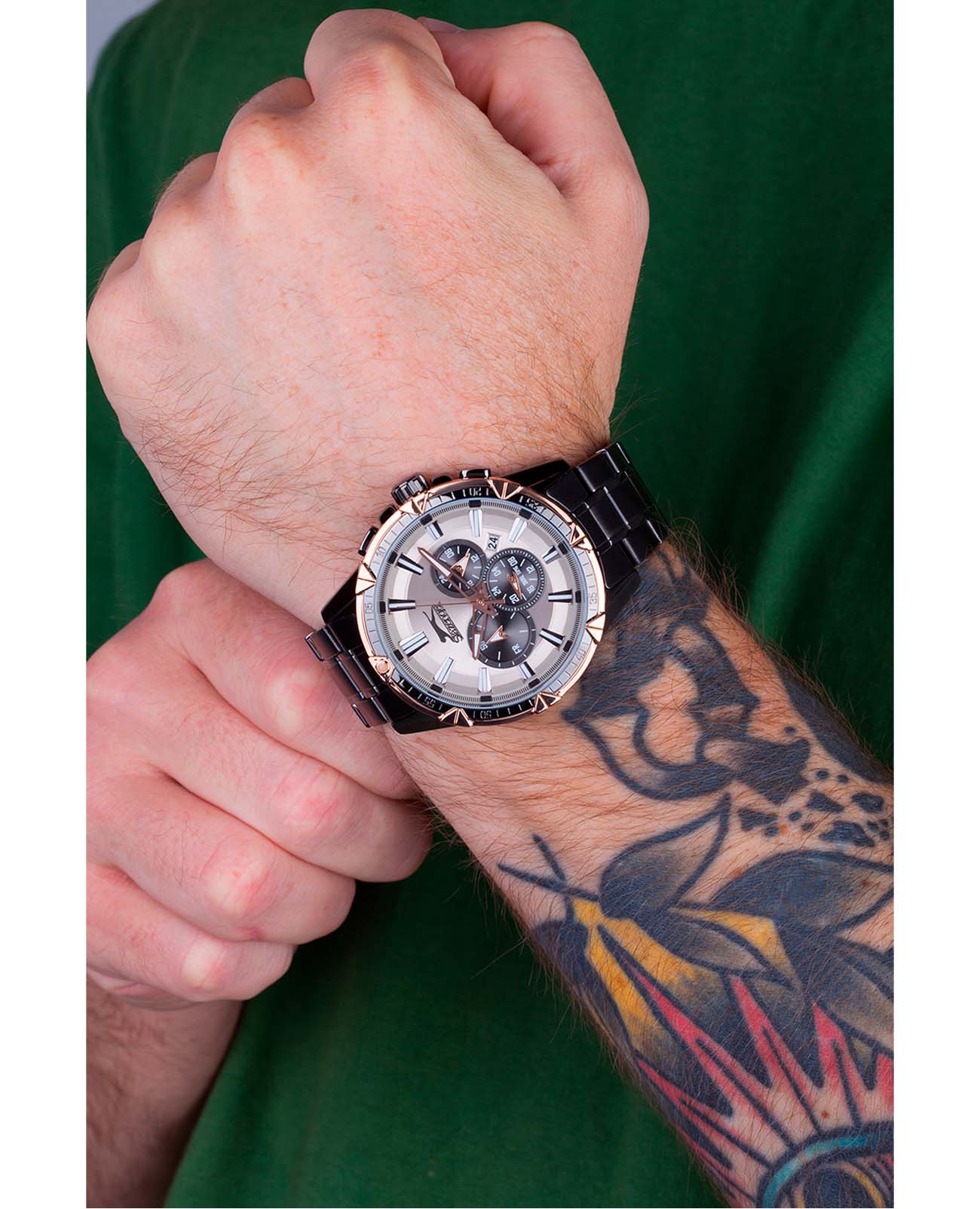 Мужские наручные часы Slazenger SL.09.2035.2.03 — это элегантный и функциональный аксессуар, сочетающий в себе классический дизайн и современные технологии. Модель обладает круглым корпусом диаметром 46 мм, выполненный из суперметалла и безельБезельВнешний ободок, закрепляющий стекло. В спортивных часах так называется поворотное кольцо с делениями на циферблате, выполняет роль таймера – замеряет отрезки времени на шкале. Неподвижный безель – элемент декора. Однонаправленно вращающийся безель на дайверских часах позволяет фиксировать моменты погружения и выныривания на поверхность. с IP-покрытиемIP-покрытиеМетод ионного напыления. Демонстрирует повышенную устойчивость к истиранию, окислению и химическим веществам. Под воздействием высокого давления и температуры около 1500°C молекулы металла надёжно соединяются с частицами корпуса часов., что обеспечивает устойчивость к царапинам и коррозии.
