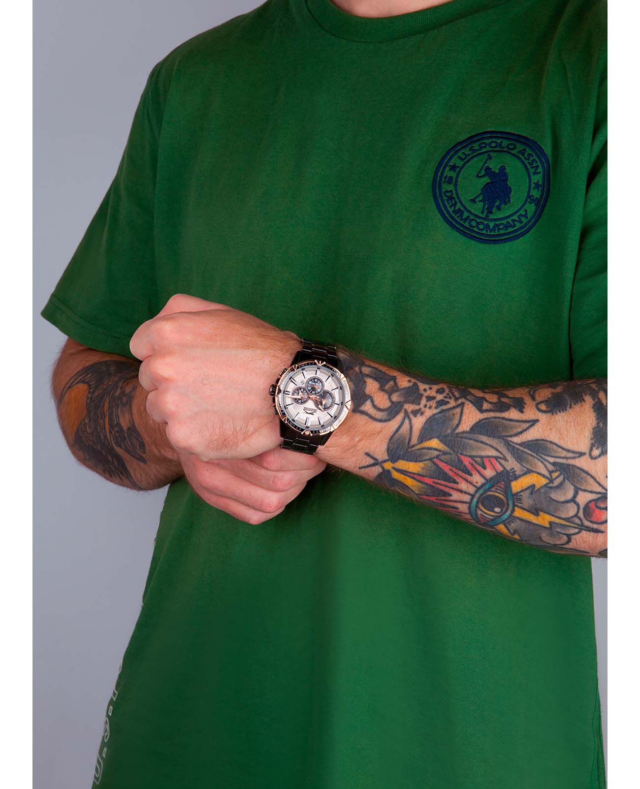 Циферблат серого цвета украшен стрелками с люминесцентным покрытиемЛюминесцентное покрытиеПозволяет считывать показания времени в темноте. Производители наносят на стрелки, часовые индексы, безель или поверхность циферблата светонакопительный состав, дающий холодное свечение., что обеспечивает читаемость времени даже в условиях слабого освещения. Для защиты циферблата используется минеральное стеклоМинеральное стеклоМинеральное стекло представляет собой искусственно выращенный минерал кварца. Такое стекло отличается особой устойчивостью к повреждениям и царапинам. Уступает по некоторым качествам сапфировому стеклу., устойчивое к царапинам и повреждениям. Браслет изготовлен из суперметалла с IP-покрытиемIP-покрытиеМетод ионного напыления. Демонстрирует повышенную устойчивость к истиранию, окислению и химическим веществам. Под воздействием высокого давления и температуры около 1500°C молекулы металла надёжно соединяются с частицами корпуса часов. на раскладной застежкойРаскладная застёжкаТакой тип застёжки используется только на браслетах из металла. Она никогда не раскрывается полностью, происходит разделение на 2 и более частей. Раскладывающая застёжка снизит вероятность потери часов к минимуму., гарантирующей удобство и надежность при ношении.