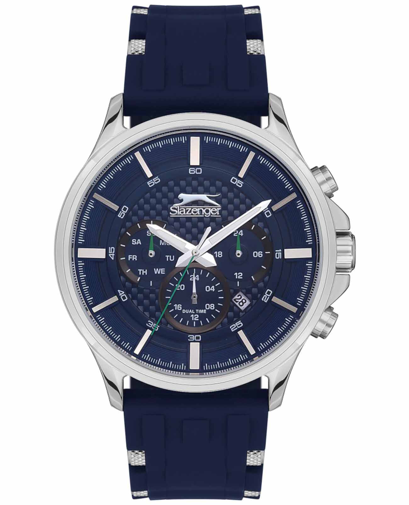 Часы Slazenger SL.09.2136.2.03 воплощают в себе элегантность и практичность, идеально подходящие для современных мужчин. Их синий циферблат, защищенный минеральным стекломМинеральное стеклоМинеральное стекло представляет собой искусственно выращенный минерал кварца. Такое стекло отличается особой устойчивостью к повреждениям и царапинам. Уступает по некоторым качествам сапфировому стеклу., заключен в корпус диаметром 47 мм, который изготовлен из прочного суперметалла серебристого цвета. Часы оснащены двойным форматом времени (12 и 24 часа), вторым часовым поясом, указателем дней недели и удобным окошком даты. Надежный кварцевый механизм обеспечивает точность, а водозащита 5 ATM делает их устойчивыми к воздействию воды. Ремень из силикона со вставками из суперметалла имеет классическую застежку, что позволяет легко регулировать его длину на запястье. Люминесцентное покрытиеЛюминесцентное покрытиеПозволяет считывать показания времени в темноте. Производители наносят на стрелки, часовые индексы, безель или поверхность циферблата светонакопительный состав, дающий холодное свечение. на стрелках и метках обеспечивает отличную видимость в темноте. Размер браслета (H1-H2): 24-22 мм.