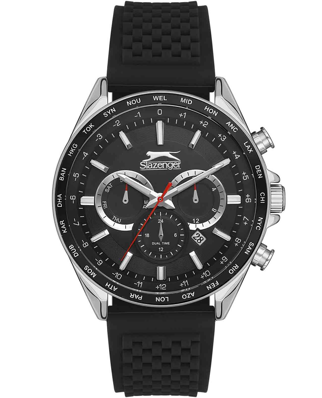 Мужские наручные часы Slazenger SL.09.2179.2.01 — стильный аксессуар с ярко выраженными спортивными чертами, который станет надежным спутником в повседневной жизни. Эти часы оснащены кварцевым механизмом, обеспечивающим высокую точность хода. Металлический корпус в сочетании с черным силиконовый ремешком на классической застежке шириной 22 мм создает гармоничный и современный образ. Диаметр корпуса составляет 45 мм, а толщина — 11 мм, что придает часам стильный и выразительный вид. БезельБезельВнешний ободок, закрепляющий стекло. В спортивных часах так называется поворотное кольцо с делениями на циферблате, выполняет роль таймера – замеряет отрезки времени на шкале. Неподвижный безель – элемент декора. Однонаправленно вращающийся безель на дайверских часах позволяет фиксировать моменты погружения и выныривания на поверхность. с черным IP-покрытиемIP-покрытиеМетод ионного напыления. Демонстрирует повышенную устойчивость к истиранию, окислению и химическим веществам. Под воздействием высокого давления и температуры около 1500°C молекулы металла надёжно соединяются с частицами корпуса часов., что придает ему дополнительную прочность и устойчивость к износу. Минеральное стеклоМинеральное стеклоМинеральное стекло представляет собой искусственно выращенный минерал кварца. Такое стекло отличается особой устойчивостью к повреждениям и царапинам. Уступает по некоторым качествам сапфировому стеклу. защищает циферблат от царапин и внешних воздействий, а водозащита уровня WR 50 позволяет не беспокоиться о случайных контактах с водой, будь то дождь или мытье рук. Особенностью данной модели является наличие календаря, отображающего дату и день недели, а также возможность следить за временем во втором часовом поясе. Люминесцентное покрытиеЛюминесцентное покрытиеПозволяет считывать показания времени в темноте. Производители наносят на стрелки, часовые индексы, безель или поверхность циферблата светонакопительный состав, дающий холодное свечение. на стрелках и метках обеспечивает отличную видимость в темноте.