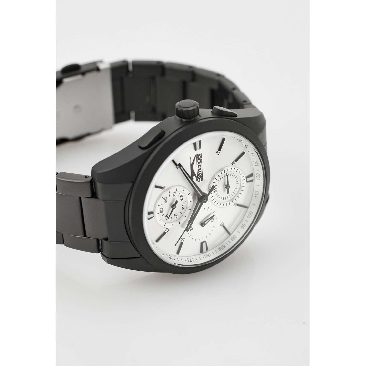 Часы Slazenger SL.09.2215.2.06 представляют собой стильные мужские наручные часы, которые сочетают в себе элегантный дизайн и функциональность. Изготовленные в Англии, эти кварцевые часы оснащены прочным металлическим корпусом и черным металлическим браслетом с раскладной застёжкойРаскладная застёжкаТакой тип застёжки используется только на браслетах из металла. Она никогда не раскрывается полностью, происходит разделение на 2 и более частей. Раскладывающая застёжка снизит вероятность потери часов к минимуму., который обеспечивает надежную фиксацию на запястье, также на них нанесено IP-покрытиеIP-покрытиеМетод ионного напыления. Демонстрирует повышенную устойчивость к истиранию, окислению и химическим веществам. Под воздействием высокого давления и температуры около 1500°C молекулы металла надёжно соединяются с частицами корпуса часов.. Минеральное стеклоМинеральное стеклоМинеральное стекло представляет собой искусственно выращенный минерал кварца. Такое стекло отличается особой устойчивостью к повреждениям и царапинам. Уступает по некоторым качествам сапфировому стеклу. защищает серебристый циферблат от царапин, а водозащита WR 50 позволяет использовать их в условиях повышенной влажности. Диаметр корпуса составляет 43 мм, а толщина — 14 мм, что делает часы удобными для ежедневного ношения. Ширина ремешка — 22 мм, что обеспечивает комфорт и стильный вид на руке. Дополнительные функции включают отображение второго часового поясаВторой часовой поясФункция, позволяющая отображать время двух часовых поясов одновременно., дня недели и текущего времени в 24-часовом формате, а также наличие окошка даты для удобства пользователя. Стрелки снабжены люминесцентным покрытиемЛюминесцентное покрытиеПозволяет считывать показания времени в темноте. Производители наносят на стрелки, часовые индексы, безель или поверхность циферблата светонакопительный состав, дающий холодное свечение., что позволяет легко считывать время в темноте. Часы также оснащены тахиметромТахиметрРазмеченная шкала, располагается на ободке или безеле часов. Тахиметр позволяет рассчитать скорость на определённом участке пути, расстояние измеряется в километрах или милях., что добавляет им функциональности и может быть полезно для измерения скорости.