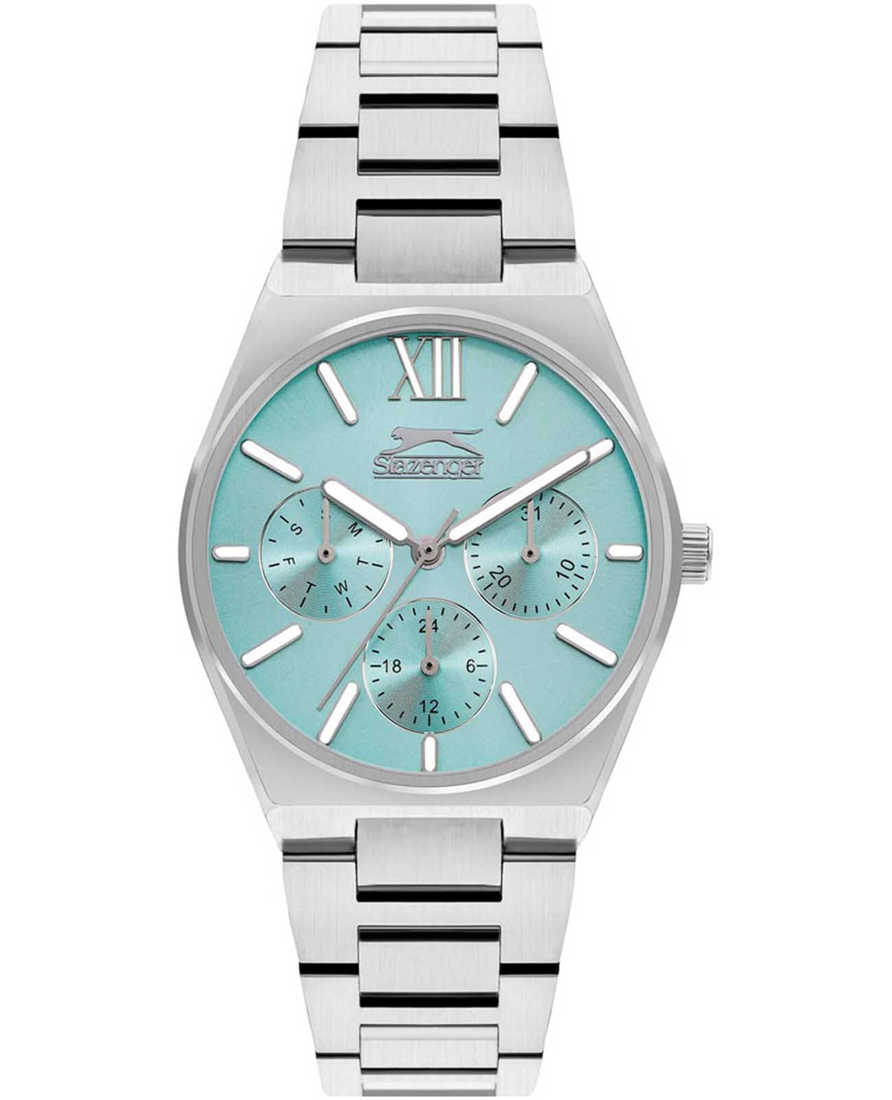 Часы Slazenger SL.09.2243.4.05 сочетают в себе элегантный дизайн и практичность для повседневного использования. Модель выполнена в изысканном серебряном цвете, корпус и браслет изготовлены из прочного металла, что обеспечивает надежность и долговечность изделия. Кварцевый механизм гарантирует точность хода, а минеральное стеклоМинеральное стеклоМинеральное стекло представляет собой искусственно выращенный минерал кварца. Такое стекло отличается особой устойчивостью к повреждениям и царапинам. Уступает по некоторым качествам сапфировому стеклу. защищает бирюзовый циферблат от механических повреждений. Диаметр корпуса составляет 34 мм, толщина — 9 мм, ширина ремешка — 20 мм, а общий вес часов — всего 87 грамм, что делает их легкими и комфортными на руке. Уровень водозащиты WR 30 позволяет не беспокоиться о случайных брызгах. Для удобства использования в темное время суток предусмотрено люминесцентное покрытиеЛюминесцентное покрытиеПозволяет считывать показания времени в темноте. Производители наносят на стрелки, часовые индексы, безель или поверхность циферблата светонакопительный состав, дающий холодное свечение. стрелок и меток. Дополнительные малые циферблаты отображают дату, день недели и время в 24-часовом формате. Часы оснащены металлическим браслетом с надежной раскладной застёжкойРаскладная застёжкаТакой тип застёжки используется только на браслетах из металла. Она никогда не раскрывается полностью, происходит разделение на 2 и более частей. Раскладывающая застёжка снизит вероятность потери часов к минимуму..