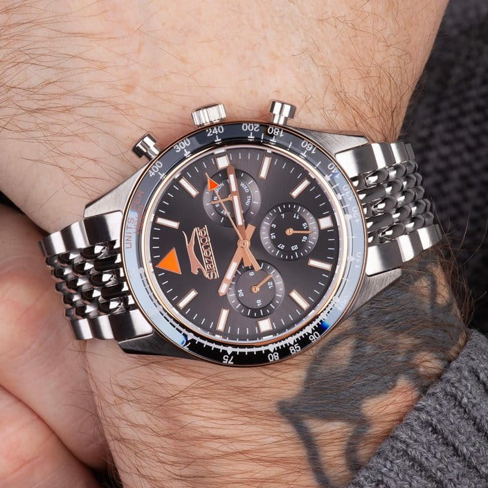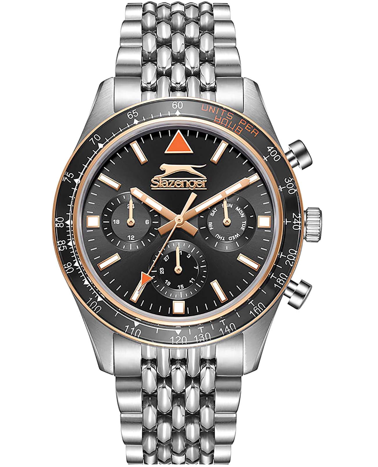 Мужские кварцевые часы Slazenger SL.09.2360.2.02 – идеальное сочетание классического дизайна и современных технологий, созданное для уверенных в себе мужчин. Корпус выполнен из суперметалла серебристого цвета, диаметром 43 мм и толщиной 12 мм, подчёркивает надежность модели и делает их идеальным аксессуаром для любой ситуации – будь то деловая встреча или повседневные выходы. Циферблат надёжно защищён минеральным стекломМинеральное стеклоМинеральное стекло представляет собой искусственно выращенный минерал кварца. Такое стекло отличается особой устойчивостью к повреждениям и царапинам. Уступает по некоторым качествам сапфировому стеклу., которое устойчиво к механическим повреждениям и сохраняет кристальную прозрачность. Неподвижный безельБезельВнешний ободок, закрепляющий стекло. В спортивных часах так называется поворотное кольцо с делениями на циферблате, выполняет роль таймера – замеряет отрезки времени на шкале. Неподвижный безель – элемент декора. Однонаправленно вращающийся безель на дайверских часах позволяет фиксировать моменты погружения и выныривания на поверхность. с IP-покрытиемIP-покрытиеМетод ионного напыления. Демонстрирует повышенную устойчивость к истиранию, окислению и химическим веществам. Под воздействием высокого давления и температуры около 1500°C молекулы металла надёжно соединяются с частицами корпуса часов. черного цвета. Стальной браслет на раскладной застёжкеРаскладная застёжкаТакой тип застёжки используется только на браслетах из металла. Она никогда не раскрывается полностью, происходит разделение на 2 и более частей. Раскладывающая застёжка снизит вероятность потери часов к минимуму. удобно облегает запястье, обеспечивая надёжность и комфорт в повседневном ношении. Стрелки и метки покрыты люминесцентным покрытиемЛюминесцентное покрытиеПозволяет считывать показания времени в темноте. Производители наносят на стрелки, часовые индексы, безель или поверхность циферблата светонакопительный состав, дающий холодное свечение., обеспечивающим отличную читаемость в темноте. Эти часы станут не просто аксессуаром, а надежным спутником в любой ситуации, подчеркивая ваш безупречный вкус и деловой стиль. Вынесенный циферблат с 24-х часовым указателем времени и функция тахиметраТахиметрРазмеченная шкала, располагается на ободке или безеле часов. Тахиметр позволяет рассчитать скорость на определённом участке пути, расстояние измеряется в километрах или милях.. Водозащита 50 метров позволит защитить корпус от случайных брызг или капель дождя.