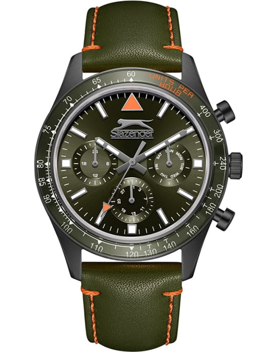 Slazenger SL.09.2361.2.06 — стильные мужские часы, сочетающие современный дизайн и функциональность. Корпус выполнен из суперметалла с PVDPVDУльтратонкое покрытие наносится в технике вакуумного напыления, сочетает в себе нитрид титана особой прочности со слоем золота или оксида хрома. Несёт в себе декоративную или защитную функцию., а безельБезельВнешний ободок, закрепляющий стекло. В спортивных часах так называется поворотное кольцо с делениями на циферблате, выполняет роль таймера – замеряет отрезки времени на шкале. Неподвижный безель – элемент декора. Однонаправленно вращающийся безель на дайверских часах позволяет фиксировать моменты погружения и выныривания на поверхность. покрыт PVDPVDУльтратонкое покрытие наносится в технике вакуумного напыления, сочетает в себе нитрид титана особой прочности со слоем золота или оксида хрома. Несёт в себе декоративную или защитную функцию.-покрытием зеленого цвета, придающим модели выразительный и элегантный вид. Минеральное стеклоМинеральное стеклоМинеральное стекло представляет собой искусственно выращенный минерал кварца. Такое стекло отличается особой устойчивостью к повреждениям и царапинам. Уступает по некоторым качествам сапфировому стеклу. защищает циферблат от царапин и гарантирует превосходную читаемость. Черный циферблат с контрастными метками и стрелками обеспечивает отличную читаемость в любых условиях. Кожаный ремешок придаёт модели классический стиль и комфорт при ношении. Функциональность дополняется индикацией даты, дня недели и 24-часовым форматом времени. Водонепроницаемость 50 метров делает модель устойчивой к случайным брызгам, идеально подходя для повседневного использования.