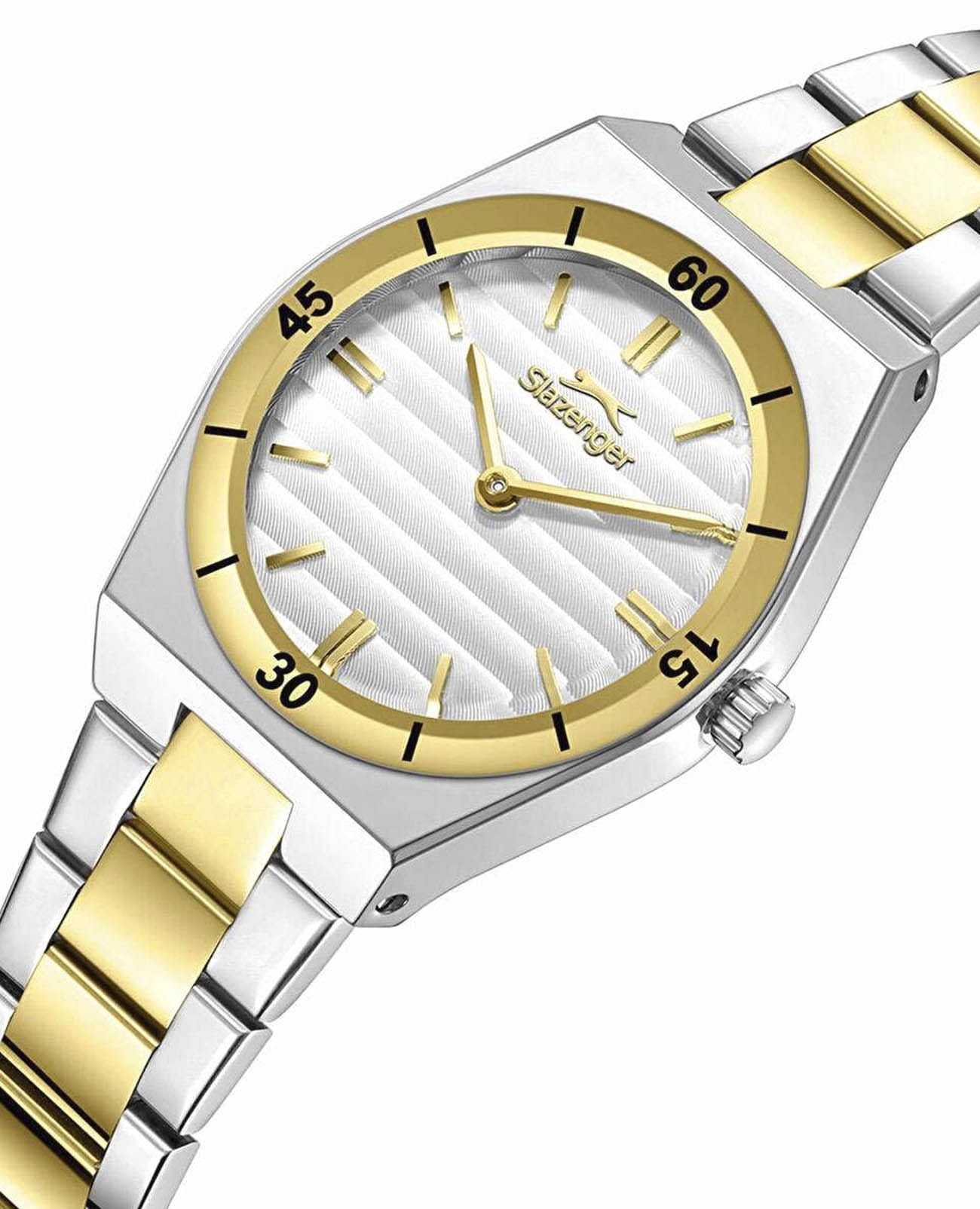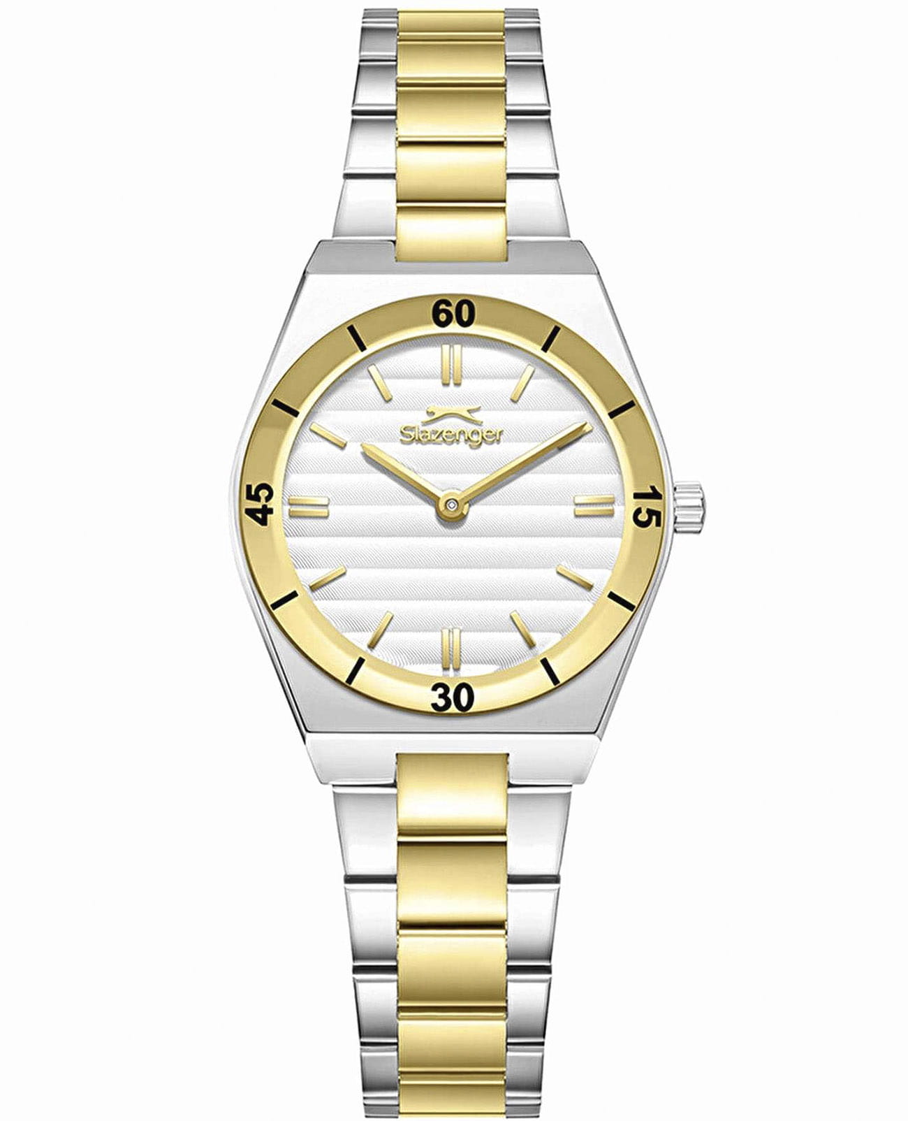 Женские кварцевые часы Slazenger — это элегантный аксессуар. Корпус диаметром 28 мм и толщиной 7,5 мм выполнен из суперметалла. БезельБезельВнешний ободок, закрепляющий стекло. В спортивных часах так называется поворотное кольцо с делениями на циферблате, выполняет роль таймера – замеряет отрезки времени на шкале. Неподвижный безель – элемент декора. Однонаправленно вращающийся безель на дайверских часах позволяет фиксировать моменты погружения и выныривания на поверхность. из суперметалла с IP-покрытиемIP-покрытиеМетод ионного напыления. Демонстрирует повышенную устойчивость к истиранию, окислению и химическим веществам. Под воздействием высокого давления и температуры около 1500°C молекулы металла надёжно соединяются с частицами корпуса часов.. Циферблат серебристого цвета оформлен индексами и стрелками. Циферблат защищён минеральным стекломМинеральное стеклоМинеральное стекло представляет собой искусственно выращенный минерал кварца. Такое стекло отличается особой устойчивостью к повреждениям и царапинам. Уступает по некоторым качествам сапфировому стеклу.. Механизм — кварцевый. Часы оснащены браслетом из суперметалла с IP-покрытиемIP-покрытиеМетод ионного напыления. Демонстрирует повышенную устойчивость к истиранию, окислению и химическим веществам. Под воздействием высокого давления и температуры около 1500°C молекулы металла надёжно соединяются с частицами корпуса часов. на раскладной застёжкеРаскладная застёжкаТакой тип застёжки используется только на браслетах из металла. Она никогда не раскрывается полностью, происходит разделение на 2 и более частей. Раскладывающая застёжка снизит вероятность потери часов к минимуму.. Водонепроницаемость 50 м позволяет использовать часы в повседневных условиях. Гарантия — 12 месяцев. Идеальный выбор для тех, кто ценит стиль и качество.
