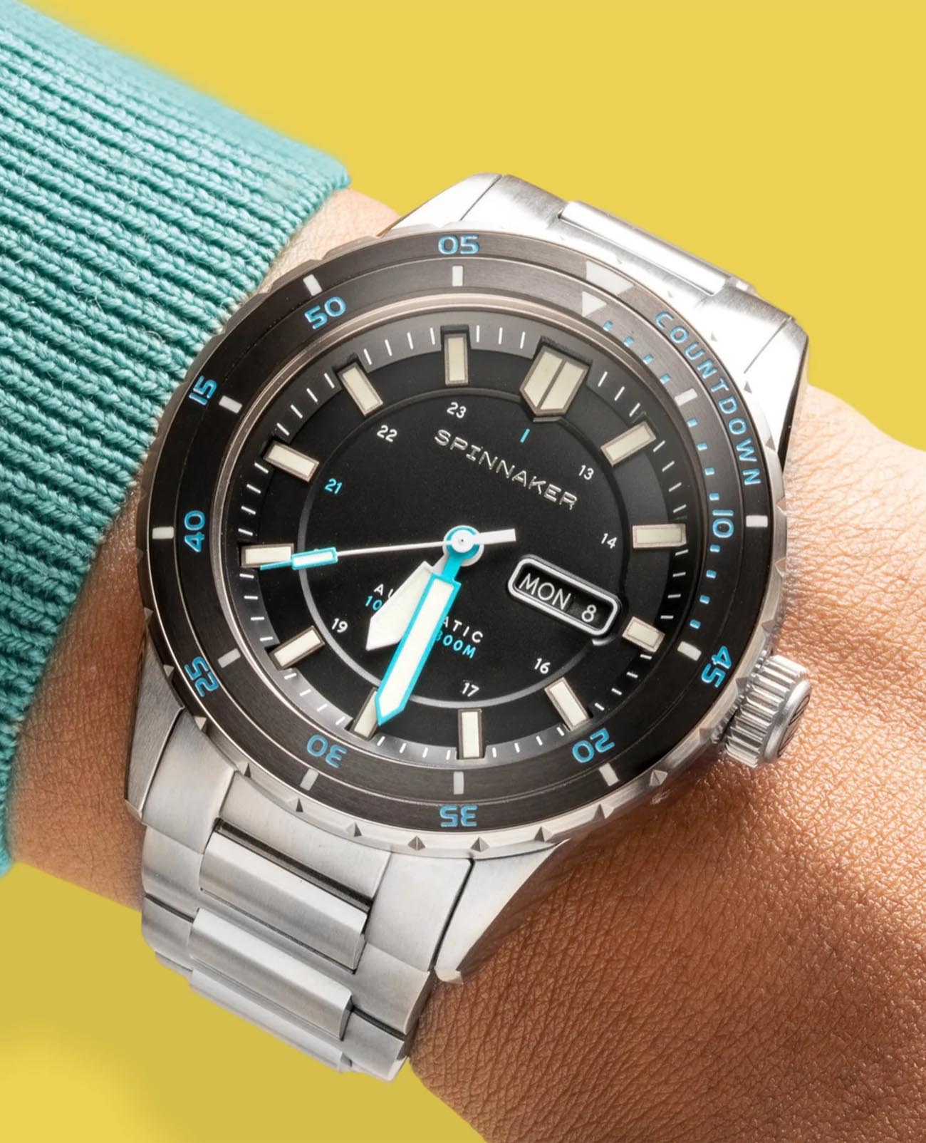 Мужские итальянские часы Spinnaker Hass SP-5099-22 с надёжным автоматическим механизмом. Сапфировое стеклоСапфировое стеклоПрочный и надёжный материал из кристалла сапфира синтетического происхождения, характеризующийся особой твёрдостью и устойчивостью к царапинам и повреждениям. с антибликовым покрытиемАнтибликовое покрытиеСлой оксида металла в 0,13-0,3 микрон, благодаря которому стекло часов не бликует и не отражает свет. Антибликовое покрытие уменьшает отражение света в 10 раз, обеспечивая отличную читаемость показателей циферблата., устойчивое к появлению царапин и обладающее высокой прозрачностью. Класс водозащиты: 300 метров, позволит плавать, нырять и заниматься другими водными видами спорта. Корпус часов изготовлен из нержавеющей стали с поворотным безелемБезельВнешний ободок, закрепляющий стекло. В спортивных часах так называется поворотное кольцо с делениями на циферблате, выполняет роль таймера – замеряет отрезки времени на шкале. Неподвижный безель – элемент декора. Однонаправленно вращающийся безель на дайверских часах позволяет фиксировать моменты погружения и выныривания на поверхность. с IP-покрытиемIP-покрытиеМетод ионного напыления. Демонстрирует повышенную устойчивость к истиранию, окислению и химическим веществам. Под воздействием высокого давления и температуры около 1500°C молекулы металла надёжно соединяются с частицами корпуса часов.. Браслет выполнен из нержавеющей стали на раскладной застёжкеРаскладная застёжкаТакой тип застёжки используется только на браслетах из металла. Она никогда не раскрывается полностью, происходит разделение на 2 и более частей. Раскладывающая застёжка снизит вероятность потери часов к минимуму.. Стрелки и метки с люминесцентным покрытиемЛюминесцентное покрытиеПозволяет считывать показания времени в темноте. Производители наносят на стрелки, часовые индексы, безель или поверхность циферблата светонакопительный состав, дающий холодное свечение.. Окошко дня недели и даты находится в положении 3 часа.