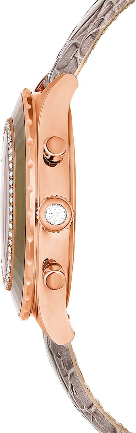 Часы Swarovski 5671153 представляют собой изысканное сочетание стиля и функциональности, идеально подходящее для ценителей элегантных аксессуаров. Эти швейцарские кварцевые часы с хронографомХронографФункция позволяет измерять отрезки времени с особой точностью: часы, минуты, секунды. Верным признаком хронографа является наличие на циферблате 3 дополнительных окошек-счётчиков. и  секундомеромСекундомерСекундоме́р — прибор, способный измерять интервалы времени с точностью до долей секунды. заключены в корпус из стали с розовым PVDPVDУльтратонкое покрытие наносится в технике вакуумного напыления, сочетает в себе нитрид титана особой прочности со слоем золота или оксида хрома. Несёт в себе декоративную или защитную функцию. покрытием, который дополнен коричневым циферблатом. Особое внимание привлекает инкрустация кристаллами Swarovski, украшающими корпус и циферблат, создавая эффектный блеск и подчеркивая роскошь изделия. Минеральное стеклоМинеральное стеклоМинеральное стекло представляет собой искусственно выращенный минерал кварца. Такое стекло отличается особой устойчивостью к повреждениям и царапинам. Уступает по некоторым качествам сапфировому стеклу. надежно защищает циферблат, а водозащита 50 WR позволяет не беспокоиться о контакте с водой в повседневных ситуациях. Эти часы не только точные и надежные, благодаря кварцевому механизму, но и невероятно стильные, благодаря кристальному безелюБезельВнешний ободок, закрепляющий стекло. В спортивных часах так называется поворотное кольцо с делениями на циферблате, выполняет роль таймера – замеряет отрезки времени на шкале. Неподвижный безель – элемент декора. Однонаправленно вращающийся безель на дайверских часах позволяет фиксировать моменты погружения и выныривания на поверхность. и коричневому ремешку из натуральной итальянской телячьей кожи с тиснением под крокодила, что обеспечивает комфортное ношение и стильный внешний вид. Заводная головка дополнительно украшена кристаллом круглой огранки, придающим часам завершенность и изящество. Люминесцентное покрытиеЛюминесцентное покрытиеПозволяет считывать показания времени в темноте. Производители наносят на стрелки, часовые индексы, безель или поверхность циферблата светонакопительный состав, дающий холодное свечение. на стрелках обеспечивает отличную видимость в темноте. Эти часы не просто аксессуар, а настоящее произведение искусства, способное стать ярким акцентом любого образа.