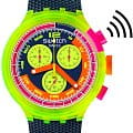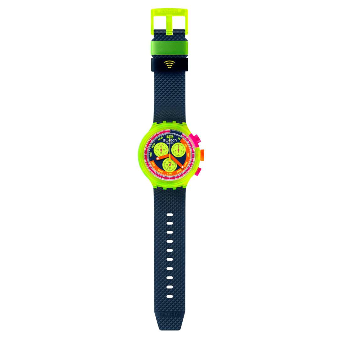 Часы Swatch SB06J101-5300 — это стильный и современный аксессуар для тех, кто ценит лёгкость и комфорт. Часы идеально подойдут как для мужчин, так и для женщин. Эти объемные ретро-часы созданы по мотивам часов Swatch Chrono 90-х годов: коллекционные GRAND PRIX SCJ101. Часы с характерным дизайном и яркой кнопкой хронографаХронографФункция позволяет измерять отрезки времени с особой точностью: часы, минуты, секунды. Верным признаком хронографа является наличие на циферблате 3 дополнительных окошек-счётчиков. на двух часах – это идеальные часы, чтобы достичь неожиданных побед. На их необычайно красочном неоновом циферблате с ярко-желтым корпусом шкала тахиметраТахиметрРазмеченная шкала, располагается на ободке или безеле часов. Тахиметр позволяет рассчитать скорость на определённом участке пути, расстояние измеряется в километрах или милях..  На часовую, минутную стрелки оранжевого цвета нанесено люминесцентное покрытиеЛюминесцентное покрытиеПозволяет считывать показания времени в темноте. Производители наносят на стрелки, часовые индексы, безель или поверхность циферблата светонакопительный состав, дающий холодное свечение., которое светится в темноте, создавая необычное изображение. Модель дополнена темно-синим ремешком из биоматериала. Эти часы имеют NFC модуль, поэтому это несомненно лучший способ оплачивать покупки. Водозащита 30 метров делает часы практичными для повседневного использования. Эти часы подойдут для повседневного ношения и станут ярким акцентом в вашем наряде.