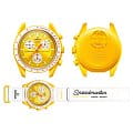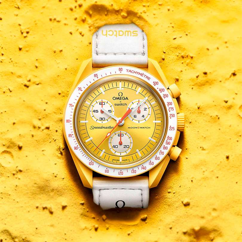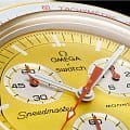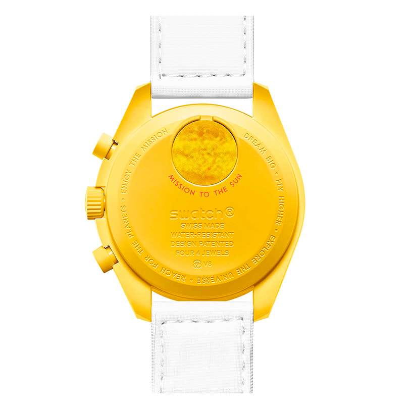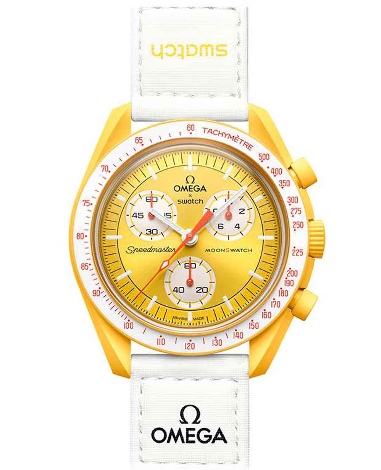 Часы Swatch Bioceramic Moonswatch MISSION TO THE SUN SO33J100 — это стильный и современный аксессуар для тех, кто ценит лёгкость и комфорт. Корпус диаметром 42 мм и пряжка этих уникальных часов изготовлены из биокерамикиБиокерамикаБиокерамика — это материал, который на две трети состоит из керамики, на одну треть — из биопластика. Он сочетает в себе лучшие качества обоих материалов и обладает прочностью и шелковистой на ощупь текстурой., а также ремешок VELCRO®. Модель оснащена желтым циферблатом и белым биокерамическим безелемБезельВнешний ободок, закрепляющий стекло. В спортивных часах так называется поворотное кольцо с делениями на циферблате, выполняет роль таймера – замеряет отрезки времени на шкале. Неподвижный безель – элемент декора. Однонаправленно вращающийся безель на дайверских часах позволяет фиксировать моменты погружения и выныривания на поверхность. на который нанесена шкала тахиметраТахиметрРазмеченная шкала, располагается на ободке или безеле часов. Тахиметр позволяет рассчитать скорость на определённом участке пути, расстояние измеряется в километрах или милях.. Общими характеристиками всех часов в данной коллекции являются конструкция стекла из биоматериала, «скрытая» в центре кристалла буква "S", тонкий и изящный круговой узор на внешнем кольце циферблата и заглубленных мини-циферблатах, гладкие ушки с заостренными концами, культовая точка над отметкой 90 на тахиметрической шкале безеля и, конечно же, уникальный материал – биокерамика. Индексы, часовая, минутная и секундная стрелки хронографаХронографФункция позволяет измерять отрезки времени с особой точностью: часы, минуты, секунды. Верным признаком хронографа является наличие на циферблате 3 дополнительных окошек-счётчиков. покрыты люминесцентным покрытиемЛюминесцентное покрытиеПозволяет считывать показания времени в темноте. Производители наносят на стрелки, часовые индексы, безель или поверхность циферблата светонакопительный состав, дающий холодное свечение. Super-LumiNova® класса А, благодаря чему они светятся в темноте. Циферблаты каждых часов в данной коллекции украшены фирменным знаком OMEGA X Swatch, культовым логотипом Speedmaster и логотипом MoonSwatch.