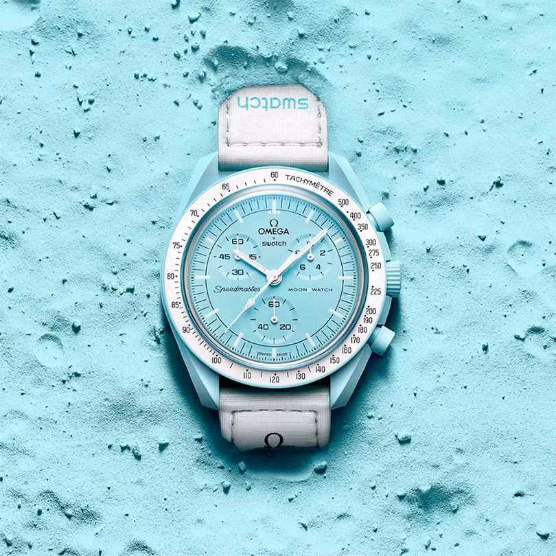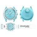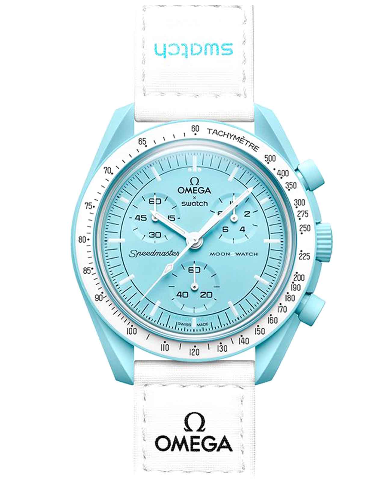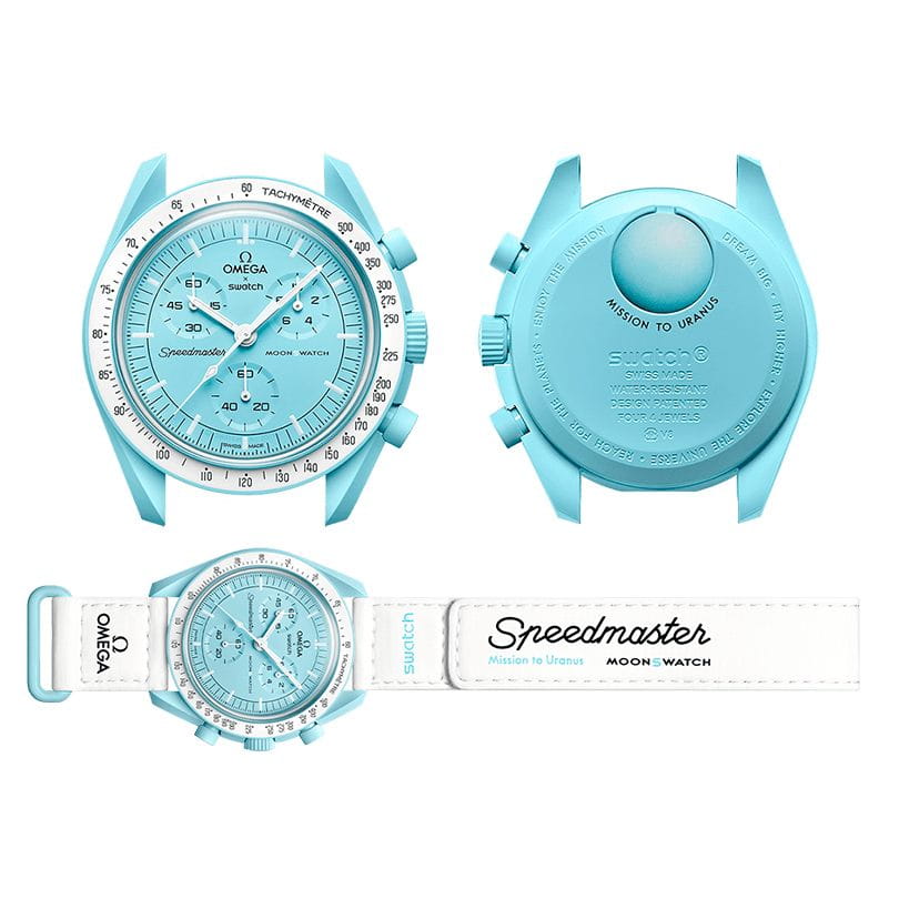 Часы Swatch Bioceramic Moonswatch MISSION TO URANUS SO33L100 — это стильный и современный аксессуар для тех, кто ценит лёгкость и комфорт. Корпус диаметром 42 мм и пряжка этих уникальных часов изготовлены из биокерамикиБиокерамикаБиокерамика — это материал, который на две трети состоит из керамики, на одну треть — из биопластика. Он сочетает в себе лучшие качества обоих материалов и обладает прочностью и шелковистой на ощупь текстурой., а также ремешок VELCRO®. Модель оснащена голубым циферблатом и белым биокерамическим безелемБезельВнешний ободок, закрепляющий стекло. В спортивных часах так называется поворотное кольцо с делениями на циферблате, выполняет роль таймера – замеряет отрезки времени на шкале. Неподвижный безель – элемент декора. Однонаправленно вращающийся безель на дайверских часах позволяет фиксировать моменты погружения и выныривания на поверхность. на который нанесена шкала тахиметраТахиметрРазмеченная шкала, располагается на ободке или безеле часов. Тахиметр позволяет рассчитать скорость на определённом участке пути, расстояние измеряется в километрах или милях.. Общими характеристиками всех часов в данной коллекции являются конструкция стекла из биоматериала, «скрытая» в центре кристалла буква "S", тонкий и изящный круговой узор на внешнем кольце циферблата и заглубленных мини-циферблатах, гладкие ушки с заостренными концами, культовая точка над отметкой 90 на тахиметрической шкале безеля и, конечно же, уникальный материал – биокерамика. Индексы, часовая, минутная и секундная стрелки хронографаХронографФункция позволяет измерять отрезки времени с особой точностью: часы, минуты, секунды. Верным признаком хронографа является наличие на циферблате 3 дополнительных окошек-счётчиков. покрыты люминесцентным покрытиемЛюминесцентное покрытиеПозволяет считывать показания времени в темноте. Производители наносят на стрелки, часовые индексы, безель или поверхность циферблата светонакопительный состав, дающий холодное свечение. Super-LumiNova® класса А, благодаря чему они светятся в темноте. Циферблаты каждых часов в данной коллекции украшены фирменным знаком OMEGA X Swatch, культовым логотипом Speedmaster и логотипом MoonSwatch.