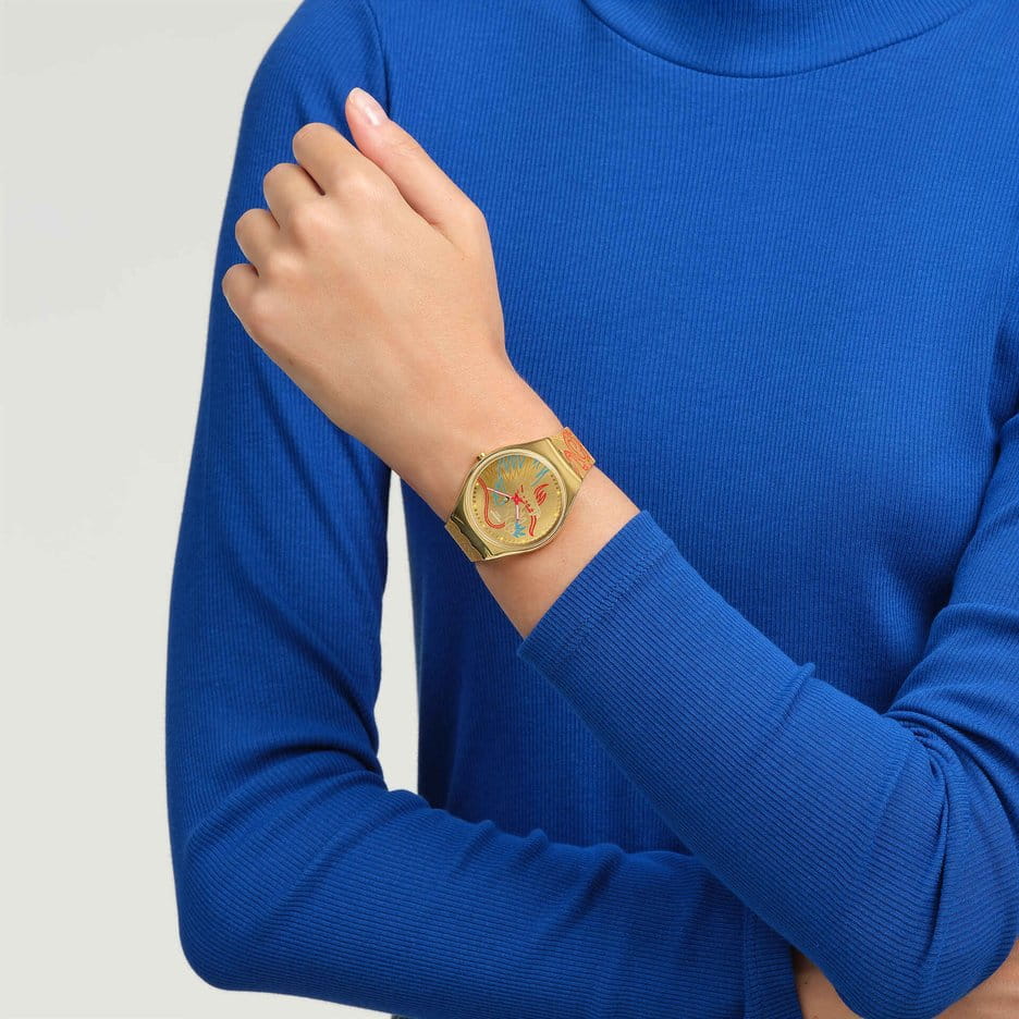 Часы Swatch SYXZ104 — это стильный и современный аксессуар для тех, кто ценит лёгкость и комфорт. Часы идеально подойдут как для мужчин, так и для женщин. Эти ультратонкие золотистые часы украшены разноцветным изображением дракона. Золотистый циферблат c PVDPVDУльтратонкое покрытие наносится в технике вакуумного напыления, сочетает в себе нитрид титана особой прочности со слоем золота или оксида хрома. Несёт в себе декоративную или защитную функцию. покрытием, с радиальной шлифовкой и принтом заключен в сияющий корпус и покрыт минеральным стекломМинеральное стеклоМинеральное стекло представляет собой искусственно выращенный минерал кварца. Такое стекло отличается особой устойчивостью к повреждениям и царапинам. Уступает по некоторым качествам сапфировому стеклу.. На золотистом ремешке с блестящей пряжкой в тон размещены два красных тренчика с надписями.  На часовую, минутную стрелки розового цвета нанесено люминесцентное покрытиеЛюминесцентное покрытиеПозволяет считывать показания времени в темноте. Производители наносят на стрелки, часовые индексы, безель или поверхность циферблата светонакопительный состав, дающий холодное свечение., которое светится в темноте, создавая необычное изображение. Водозащита 30 метров делает часы практичными для повседневного использования. Эти часы подойдут для повседневного ношения и станут ярким акцентом в вашем наряде.