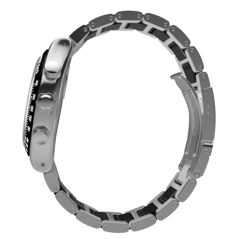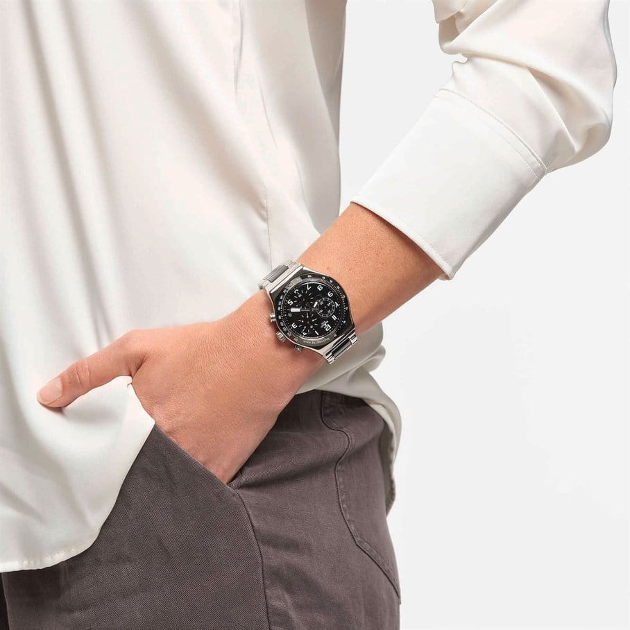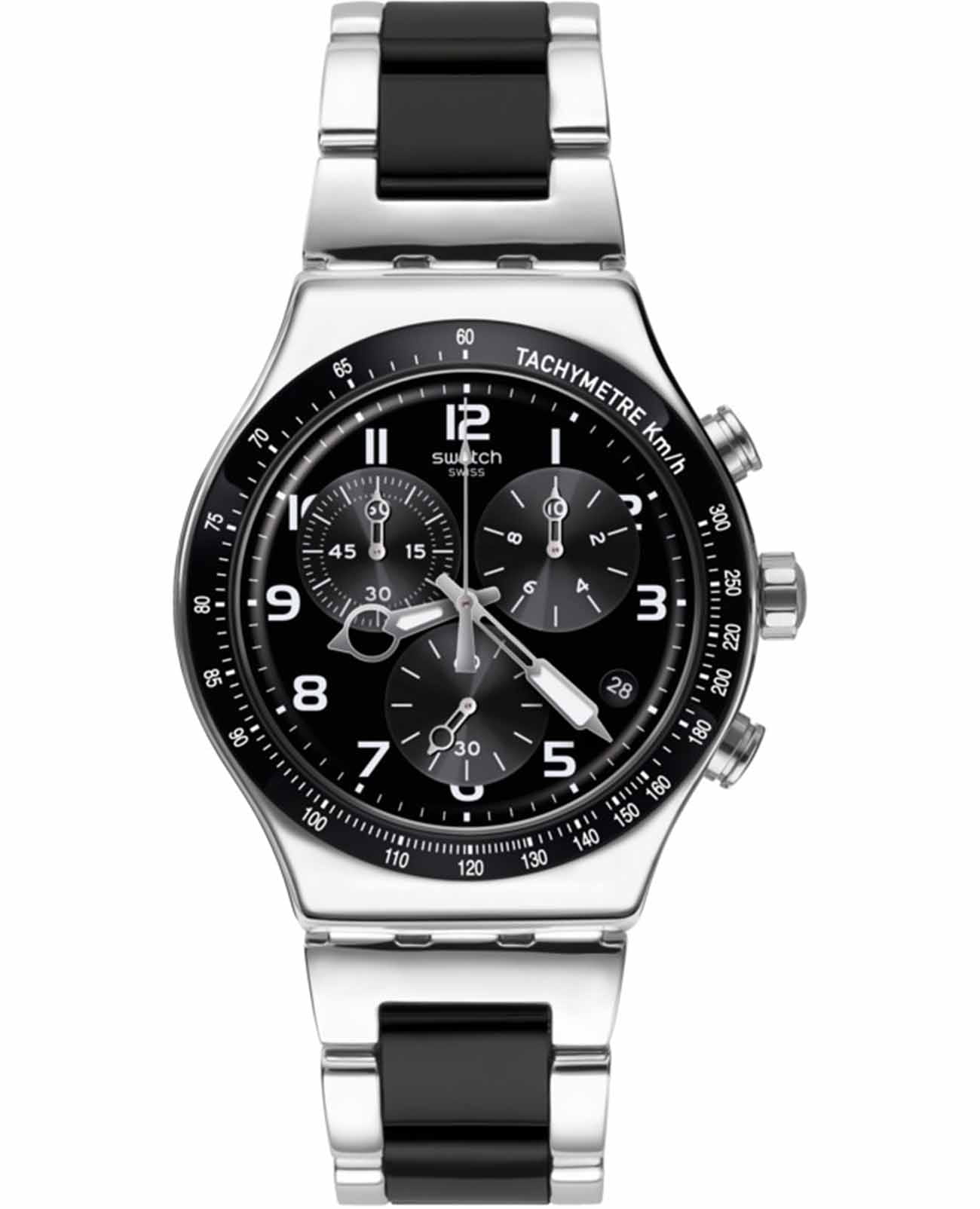 Часы Swatch YVS441G — это стильный и современный аксессуар для тех, кто ценит лёгкость и комфорт. Этот стильный хронографХронографФункция позволяет измерять отрезки времени с особой точностью: часы, минуты, секунды. Верным признаком хронографа является наличие на циферблате 3 дополнительных окошек-счётчиков. революция стиля, ведь в ней изящно сочетаются спортивный дух и подчеркнутая элегантность. Эти часы оснащены черным циферблатом с радиальной полировкой и белым принтом, а также окошком даты в положении «4:30» и стрелками с люминесцентным покрытиемЛюминесцентное покрытиеПозволяет считывать показания времени в темноте. Производители наносят на стрелки, часовые индексы, безель или поверхность циферблата светонакопительный состав, дающий холодное свечение.. БезельБезельВнешний ободок, закрепляющий стекло. В спортивных часах так называется поворотное кольцо с делениями на циферблате, выполняет роль таймера – замеряет отрезки времени на шкале. Неподвижный безель – элемент декора. Однонаправленно вращающийся безель на дайверских часах позволяет фиксировать моменты погружения и выныривания на поверхность. из полированной стали с черным PVDPVDУльтратонкое покрытие наносится в технике вакуумного напыления, сочетает в себе нитрид титана особой прочности со слоем золота или оксида хрома. Несёт в себе декоративную или защитную функцию. покрытием имеет гравировку, выполненную белой эмалью, и помещен в корпус из полированной нержавеющей стали. Регулируемый браслет с раскладной застёжкойРаскладная застёжкаТакой тип застёжки используется только на браслетах из металла. Она никогда не раскрывается полностью, происходит разделение на 2 и более частей. Раскладывающая застёжка снизит вероятность потери часов к минимуму., напоминающий длинную черную гоночную трассу, изготовлен из нержавеющей стали со звеньями из черного каучука. Водозащита 30 метров делает часы практичными для повседневного использования. Эти часы подойдут для повседневного ношения и станут ярким акцентом в вашем наряде.