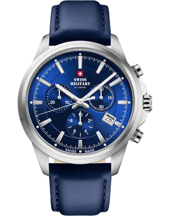 Часы Swiss Military SM34107.12 — это хронограф, сочетающий стиль и функциональность. Корпус диаметром 40 мм выполнен из нержавеющей стали, что обеспечивает долговечность и надёжность. Циферблат с солнечным узором украшен белыми люминесцентными индексамиЛюминесцентное покрытиеПозволяет считывать показания времени в темноте. Производители наносят на стрелки, часовые индексы, безель или поверхность циферблата светонакопительный состав, дающий холодное свечение. и стрелками, что позволяет легко считывать время в любых условиях. Защиту циферблата обеспечивает сапфировое стеклоСапфировое стеклоПрочный и надёжный материал из кристалла сапфира синтетического происхождения, характеризующийся особой твёрдостью и устойчивостью к царапинам и повреждениям., устойчивое к царапинам. Водозащита до 10 ATM делает часы подходящими для плавания и других водных активностей. Швейцарский кварцевый механизм обеспечивает высокую точность измерения времени и функции хронографа. Кожаный ремень на стандартной застежке гарантирует комфортное ношение и надёжную фиксацию. Часы сопровождаются 5-летней международной гарантией, подтверждающей их высокое качество и надёжность. Swiss Military — это идеальный выбор для мужчин, которые ценят швейцарское качество и ведут активный образ жизни.