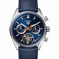 Часам TAG Heuer Carrera Chronograph Tourbillon CBS5010.FC6543 60 лет, а острые ощущения продолжаются. В честь 60-летия Carrera эта синяя версия нового TAG Heuer Carrera уверенно завоевывает статус абсолютной иконы. Эти классические гоночные часы, оснащенные синими счетчиками "azurage" с технологией Super-LumiNova® и эффектным механизмом Heuer 02 с турбийоном в положении "6 часов", решительно не поддаются остановке. Часы-хронографХронографФункция позволяет измерять отрезки времени с особой точностью: часы, минуты, секунды. Верным признаком хронографа является наличие на циферблате 3 дополнительных окошек-счётчиков.. Механический механизм (автоматический калибр) с высокой точностью. Класс водозащиты: 100 метров, позволит плавать, нырять и заниматься другими водными видами спорта. Сапфировое стеклоСапфировое стеклоПрочный и надёжный материал из кристалла сапфира синтетического происхождения, характеризующийся особой твёрдостью и устойчивостью к царапинам и повреждениям. устойчивое к появлению царапин, обладающее высокой прозрачностью. Стрелки с люминесцентным покрытиемЛюминесцентное покрытиеПозволяет считывать показания времени в темноте. Производители наносят на стрелки, часовые индексы, безель или поверхность циферблата светонакопительный состав, дающий холодное свечение.. Корпус часов изготовлен из нержавеющей стали. Кожаный ремешок с раскладной застёжкойРаскладная застёжкаТакой тип застёжки используется только на браслетах из металла. Она никогда не раскрывается полностью, происходит разделение на 2 и более частей. Раскладывающая застёжка снизит вероятность потери часов к минимуму..
