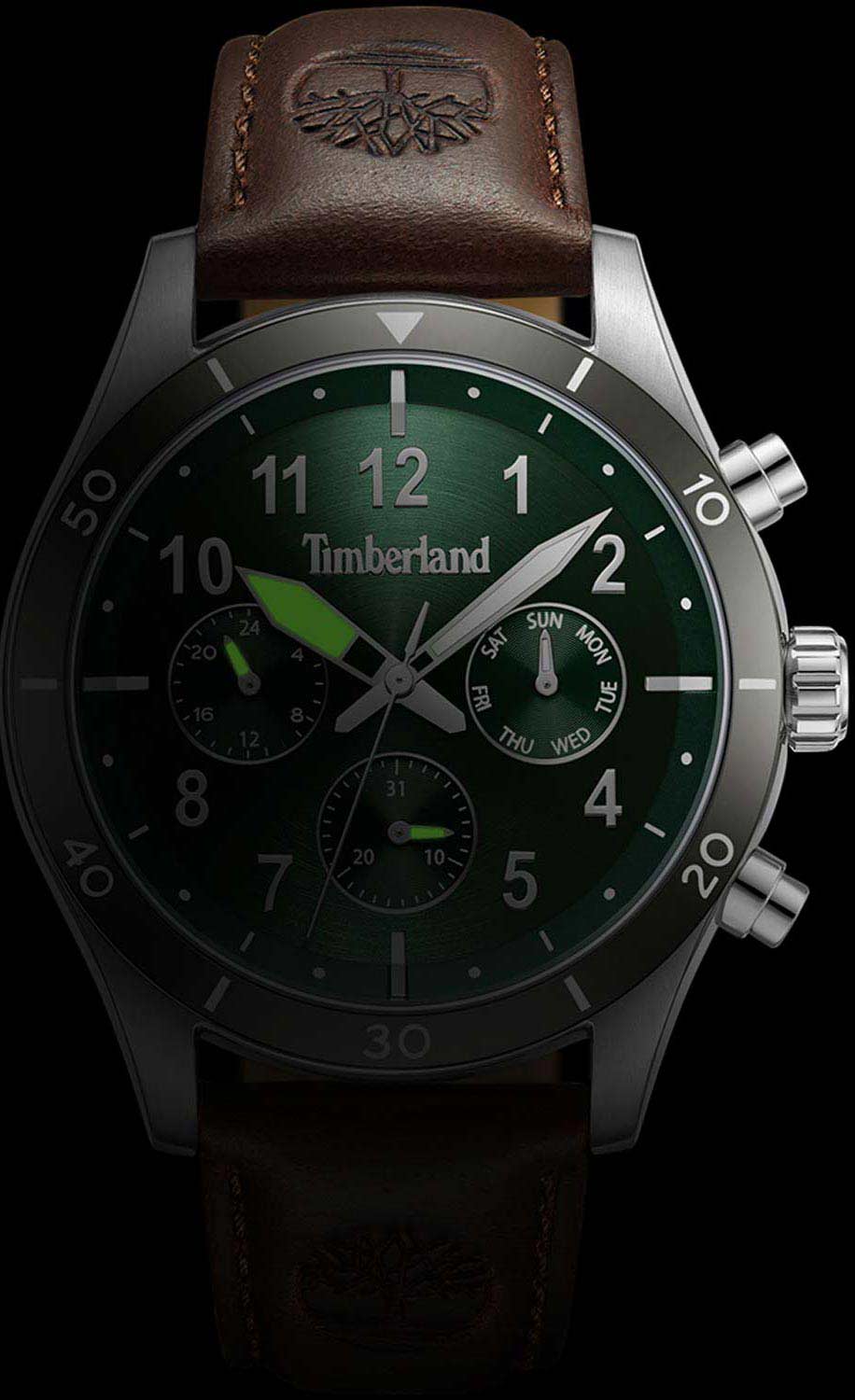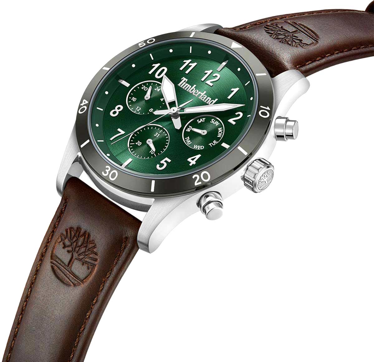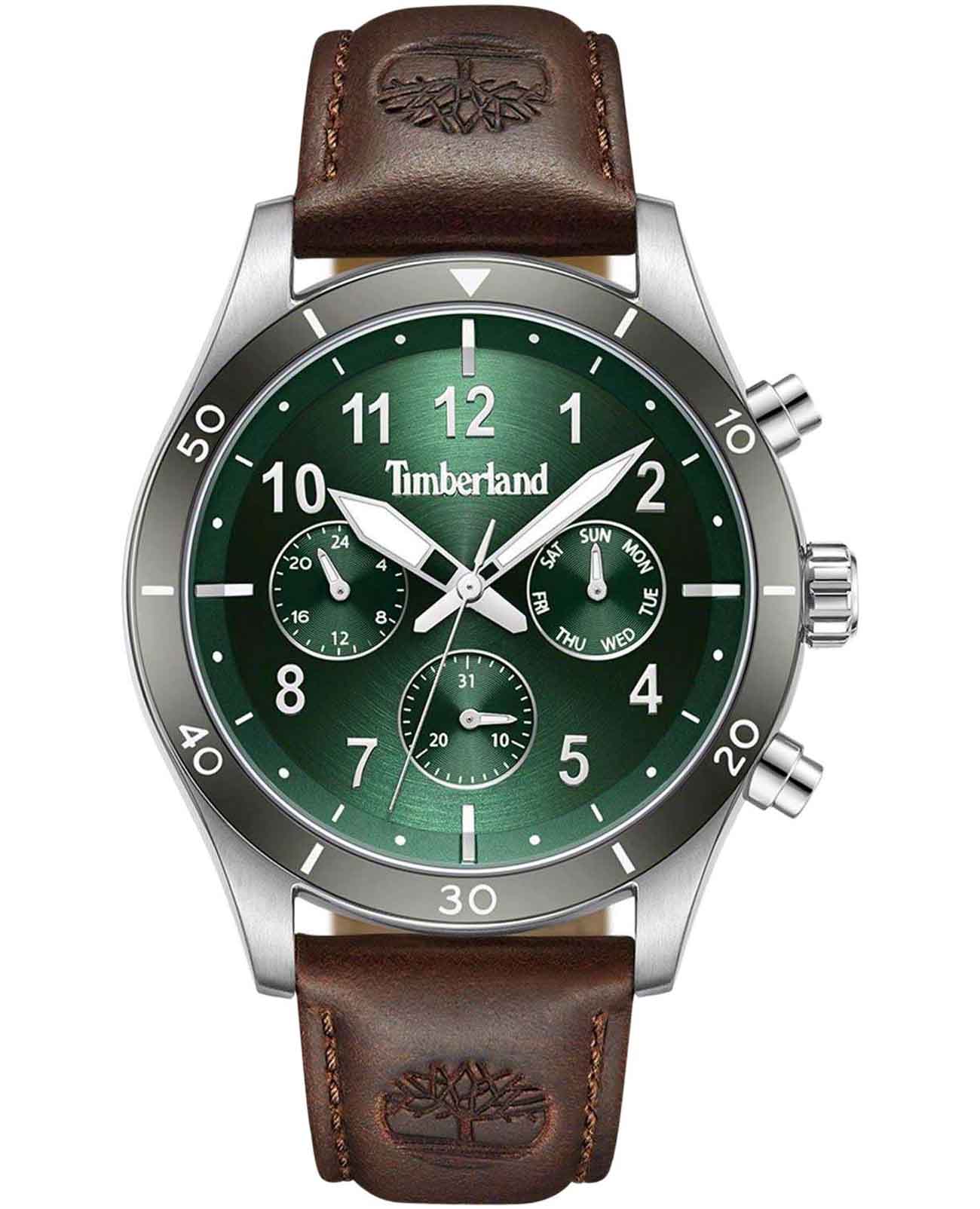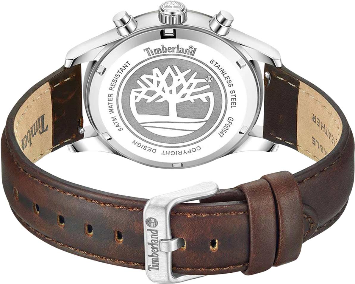 Американские мужские часы-хронографХронографФункция позволяет измерять отрезки времени с особой точностью: часы, минуты, секунды. Верным признаком хронографа является наличие на циферблате 3 дополнительных окошек-счётчиков. Timberland Ashmont TDWGF0054702имеют кварцевый механизм с высокой точностью. Класс водозащиты: 50 метров, позволит защитить корпус от случайных брызг или капель дождя. Корпус часов изготовлен из стали с PVD-покрытиемPVDУльтратонкое покрытие наносится в технике вакуумного напыления, сочетает в себе нитрид титана особой прочности со слоем золота или оксида хрома. Несёт в себе декоративную или защитную функцию.. Прочное минеральное стеклоМинеральное стеклоМинеральное стекло представляет собой искусственно выращенный минерал кварца. Такое стекло отличается особой устойчивостью к повреждениям и царапинам. Уступает по некоторым качествам сапфировому стеклу.. Циферблат выполнен по технологии Sunray (солнечные лучи) и украшен логотипом бренда. Метки в виде арабских цифр и штрихов. Время в 24-х часовом формате, число и день недели вынесены на отдельные циферблаты. Стрелки c люминесцентным покрытиемЛюминесцентное покрытиеПозволяет считывать показания времени в темноте. Производители наносят на стрелки, часовые индексы, безель или поверхность циферблата светонакопительный состав, дающий холодное свечение.. Кожаный ремешок с классической застежкой и системой быстрой замены.
