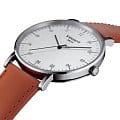 Классический аксессуар имеет элегантный циферблат без лишних деталей - только тонкие стрелки, арабские цифры и часовая разметка. Корпус изготовлен из хирургической стали 316L, устойчивой к коррозии, он защищает кварцевый швейцарский калибр ETA 902.101. Коричневый ремешок выполнен из натуральной кожи с тиснением под рисунок кожи крокодила. Сапфировое стекло противостоит появлению царапин. Водостойкость WR 30. Габариты: 42 x 42 x 6,5 мм.
