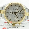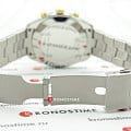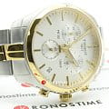 Спортивный кварцевый хронографХронографФункция позволяет измерять отрезки времени с особой точностью: часы, минуты, секунды. Верным признаком хронографа является наличие на циферблате 3 дополнительных окошек-счётчиков. измеряет время с особой точностью, позволяет забыть о необходимости регулярного завода. Стильный циферблат белого цвета имеет контрастные часовые метки, спортивной стилистики добавляют мини-счётчики. Швейцарский кварцевый механизм ETA G10.211 с 4 камнями. Надёжный корпус из нержавеющей стали 316L с золотистым PVD-покрытиемPVDУльтратонкое покрытие наносится в технике вакуумного напыления, сочетает в себе нитрид титана особой прочности со слоем золота или оксида хрома. Несёт в себе декоративную или защитную функцию.. Люминесцентная подсветкаЛюминесцентное покрытиеПозволяет считывать показания времени в темноте. Производители наносят на стрелки, часовые индексы, безель или поверхность циферблата светонакопительный состав, дающий холодное свечение.. Сапфировое стекло. Водостойкость 10 бар. Прямоугольное окошко даты. Габариты: 41 x 41 x 10,7 мм.