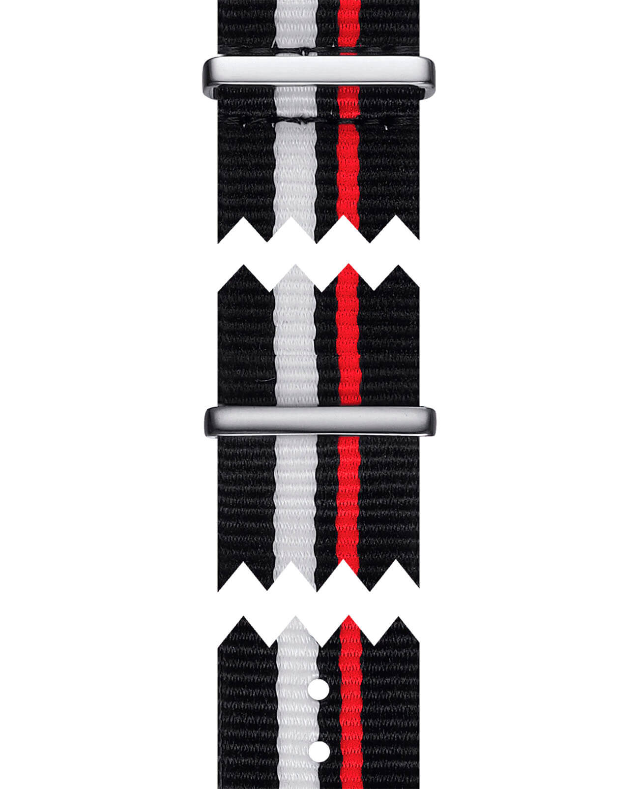 Массивный динамичный хронографХронографФункция позволяет измерять отрезки времени с особой точностью: часы, минуты, секунды. Верным признаком хронографа является наличие на циферблате 3 дополнительных окошек-счётчиков. с белым циферблатом комплектуется разноцветным синтетическим ремешком НАТО. Такое исполнение позволяет добавить в образ яркие краски. Корпус сделан из прочной и долговечной нержавеющей стали 316L, он защищает кварцевый механизм ETA G10.211. Среди функциональных особенностей - секундомер, тахиметрТахиметрРазмеченная шкала, располагается на ободке или безеле часов. Тахиметр позволяет рассчитать скорость на определённом участке пути, расстояние измеряется в километрах или милях., отображение даты. Водонепроницаемость 100 метров. Сапфировое стекло. Габариты: 42 x 42 x 10,7 мм.