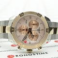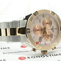 Спортивные элементы дизайна переплетаются с классическими, весьма женственно выглядят нежно-розовые счётчики и стрелки. Модель и центральный ряд звеньев браслета имеют PVD-покрытиеPVDУльтратонкое покрытие наносится в технике вакуумного напыления, сочетает в себе нитрид титана особой прочности со слоем золота или оксида хрома. Несёт в себе декоративную или защитную функцию. корпуса в цвете розового золота. Кварцевый калибр ETA G15.212 обеспечивает высокую точность хода. Водонепроницаемость при давлении 10 бар. Безопасная застёжка не допустит случайное расстёгивание браслета. Окошко даты, секундомер. Габариты: 38 x 38 x 10,5 мм.
