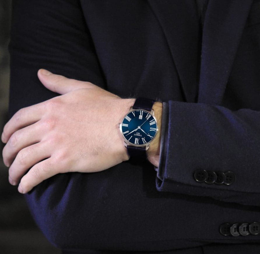 Лаконичный и классический стиль аксессуара разбавлен синим акцентом в виде ремешка и циферблата, красиво смотрятся тонкие удлинённые стрелки. Белый циферблат имеет оригинальное исполнение, благодаря чему он визуально кажется больше. Стальной корпус (сверхтонкий - 7 мм) надёжно защищает кварцевый механизм ETA F06.115 от повреждений. Прочное сапфировое стекло. Водостойкость 50 метров - часы выдержат капли дождя, мытье посуды и уборку. Ремешок из натуральной кожи. Индикация числа. EOLEOLПредставляет собой систему, уведомляющую владельца часов о необходимости замены элемента питания. За 2 недели до полного разряда батарейки секундная стрелка перестаёт ходить чётко и начинает перепрыгивать на 3-4 деления.. Габариты: 40 x 40 x 7 мм.