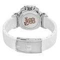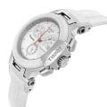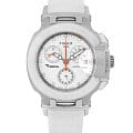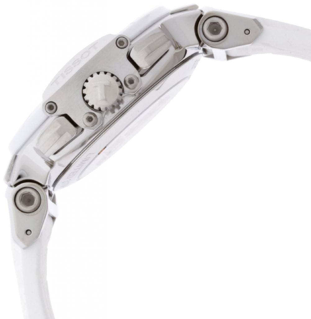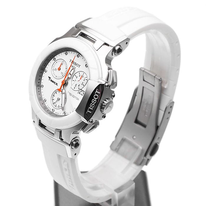 TISSOT T-Sport T-Race Quartz Chronograph - женские кварцевые наручные часы. Корпус этих часов среднего размера (37 мм) и выполнен из нержавеющей стали L316 металлического цвета. Модель имеет устойчивое к царапинам сапфировое стекло, силиконовый ремешок белого цвета, белый циферблат. Калибр механизма: ETA G15.211. Класс водозащиты: 100 м / 10 АТМ (разрешается плавание и ныряние без акваланга). Дополнительные функции и особенности: отображение числа, хронограф (секундомер), тахиметр.