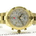 Стильный хронографХронографФункция позволяет измерять отрезки времени с особой точностью: часы, минуты, секунды. Верным признаком хронографа является наличие на циферблате 3 дополнительных окошек-счётчиков. наделён женственным внешним обликом. Перламутровый циферблат дополнен драгоценными камнями, вместо часовых индексов используются 12 бриллиантов в 0,0456 карат. Швейцарский кварцевый механизм ETA G15.212. Сапфировое стекло не допускает возникновения царапин. Водонепроницаемость до 10 бар. PVD-покрытиеPVDУльтратонкое покрытие наносится в технике вакуумного напыления, сочетает в себе нитрид титана особой прочности со слоем золота или оксида хрома. Несёт в себе декоративную или защитную функцию. золотистого цвета. Стрелки с люминесцентной подсветкойЛюминесцентное покрытиеПозволяет считывать показания времени в темноте. Производители наносят на стрелки, часовые индексы, безель или поверхность циферблата светонакопительный состав, дающий холодное свечение.. Браслет с . Отображение даты, секундомер. Габариты: 38 x 38 x 10,5 мм.