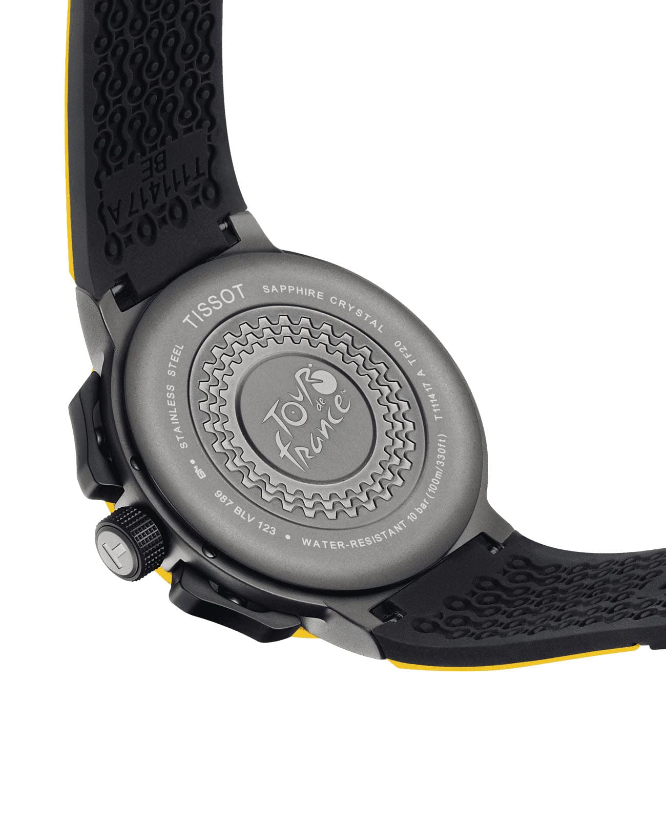Мужские наручные часы Limited Edition из коллекции T-Race Cycling посвящены известной велогонке Tour de France, о чём нам говорит оригинальная гравировка на задней крышке.